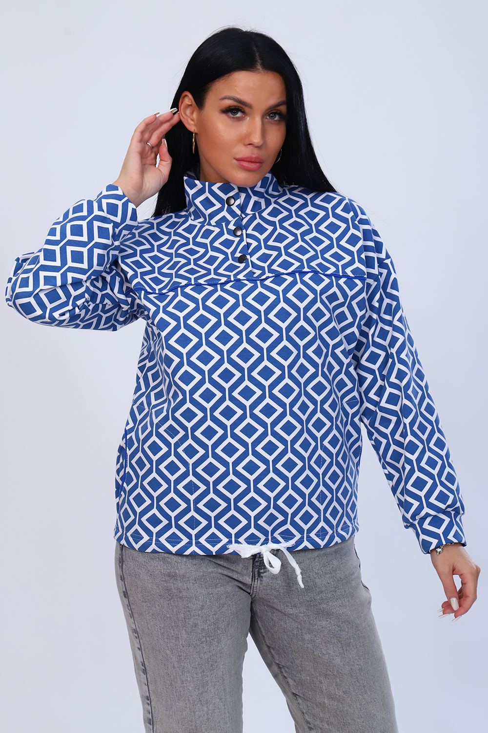 Женская оригинальная толстовка в стиле анорак из набивного футера. Подойдет как к спортивному стилю с кроссовками, так и к джинсам с грубыми ботинками или челси. Такая вещь подойдет на любой сезон - летом как ветровка, зимой как толстовка под верхнюю одежду. Анорак свободного кроя с карманами в боковых швах. Рукав длинный со спущенной линией плеча на манжете. Воротник - стойка с застежкой до середины груди на кнопки. По низу идет шнурок для стягивания анорака. Кокетка и карманы отделаны кантом