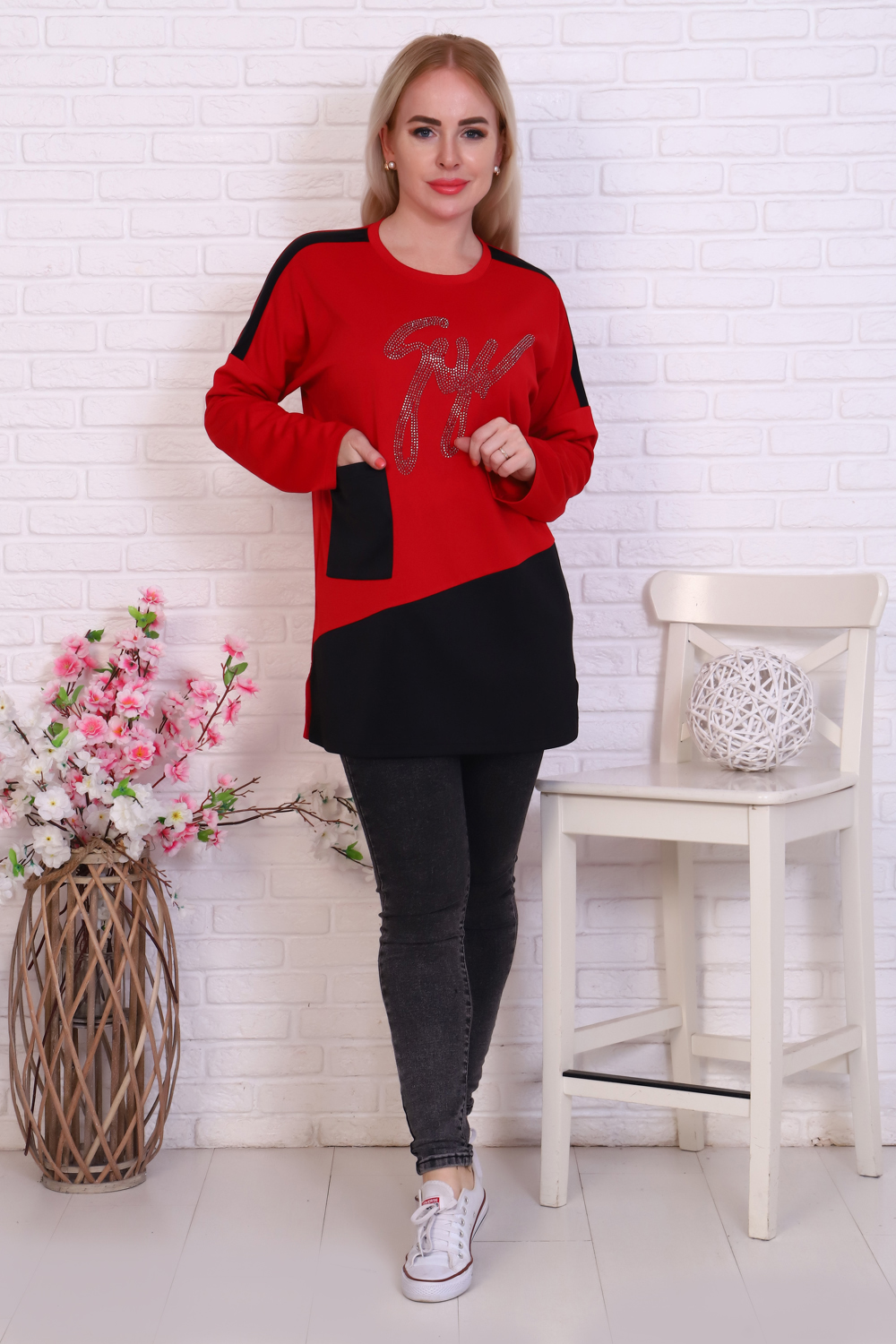 Комбинированная трикотажная туника женственного фасона летучая мышь. Спереди тунику украшает аппликация со стразами - модный декор женской одежды этого сезона. Накладной карман прекрасно сочетается с низом изделия.