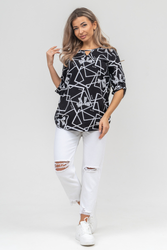 Женская туника прямого силуэта со спущенным плечом выполнена из 100% хлопчатобумажной ткани. Горловина и рукава обработаны ярким красным кантом, а крупный купонный рисунок по краю ткани придаёт изделию по-своему оригинальный вид. Данная модель идеально подойдёт для дома и отдыха.