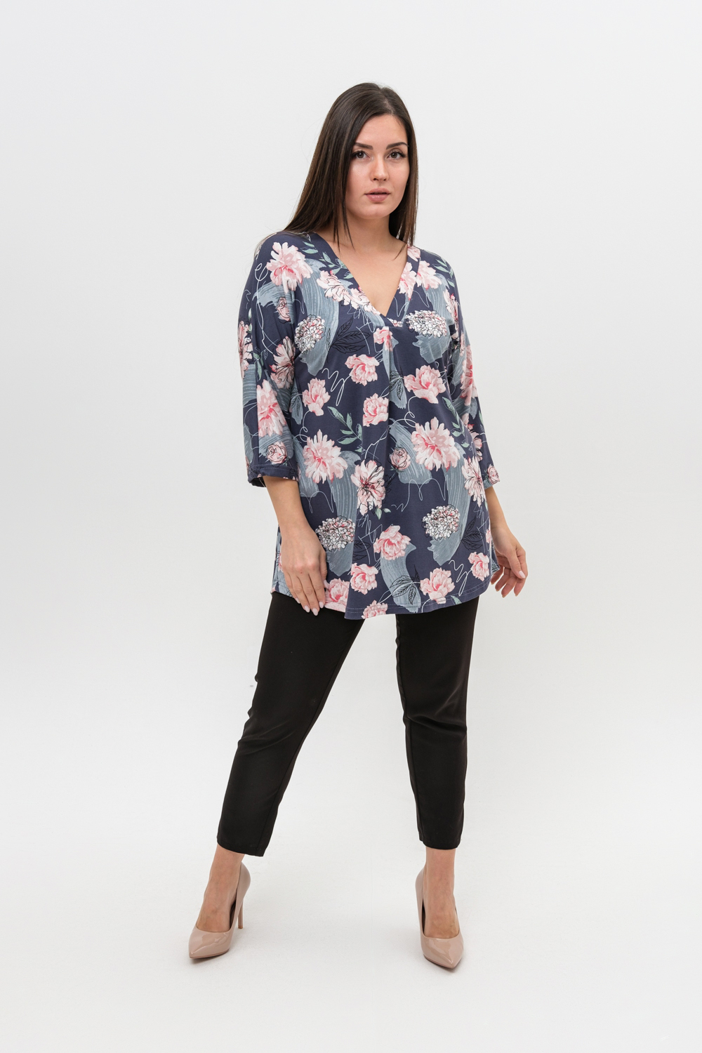 Туника женская со спущенным цельнокроеным рукавом длиной 3/4 выполнена из вискозы красивой, нежной расцветки. Горловина туники имеет V-образный вырез, обработана планкой, низ изделия немного расклешен. Ткань хорошего качества, при стирке не линяет, не дает усадку, сохраняет форму.