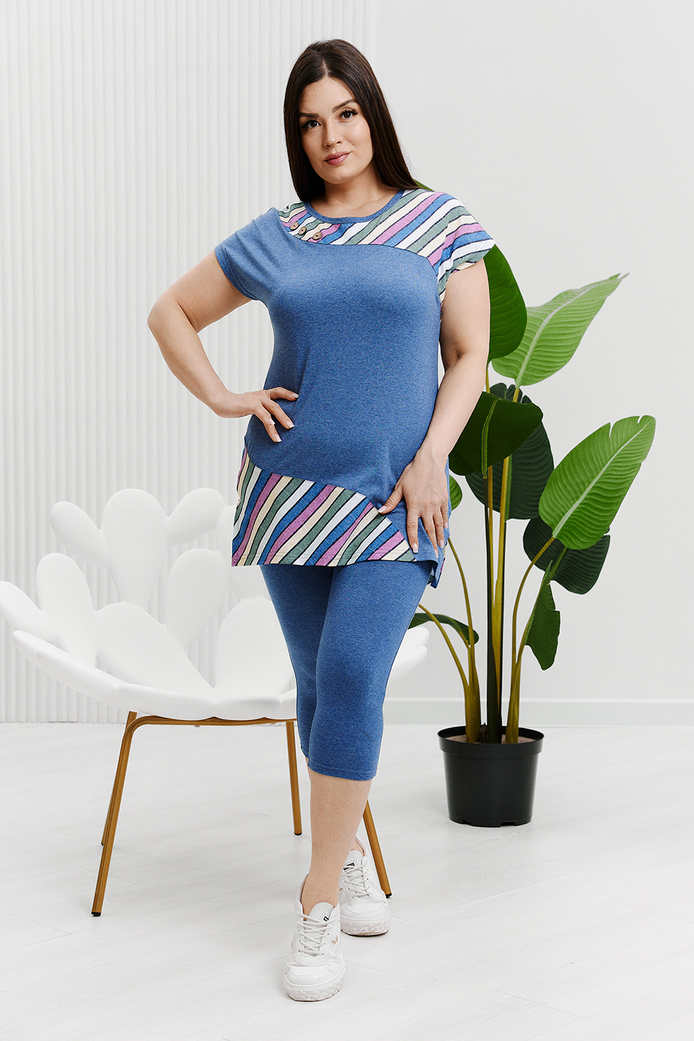 Туника прилегающего силуэта, ассиметричного кроя. Рукава цельнокроеные короткие. В боковых швах по низу разрезы.