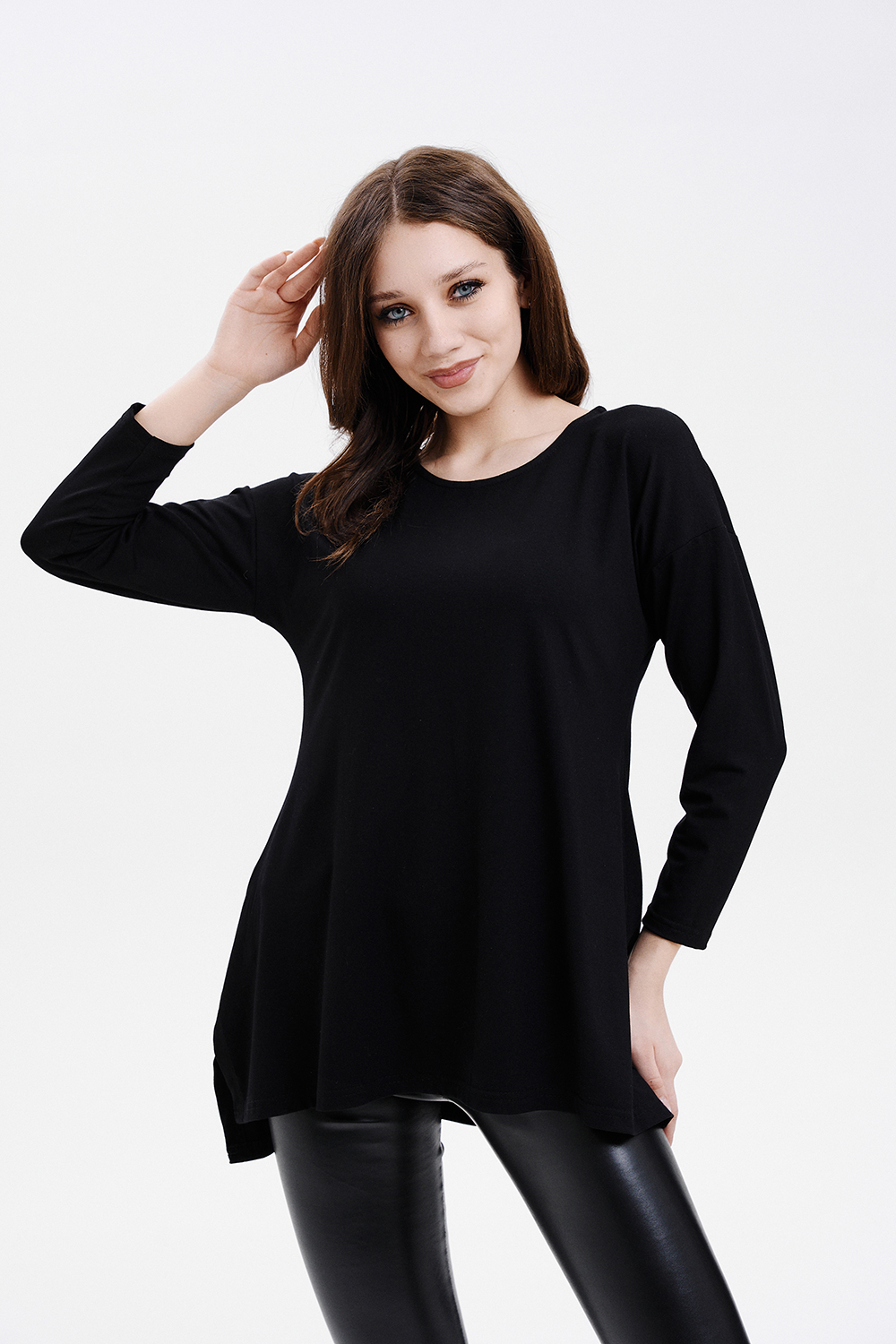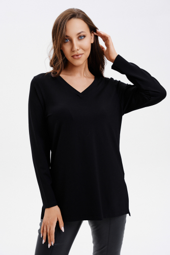 Туника трапецивидного силуэта с расклешением от линии талии, с округлой горловиной, с фигурной линией низа, с разрезами в нижней части боковых швов. Спинка удлиненная. Рукав длинный. Горловина обработана бейкой из основного полотна.