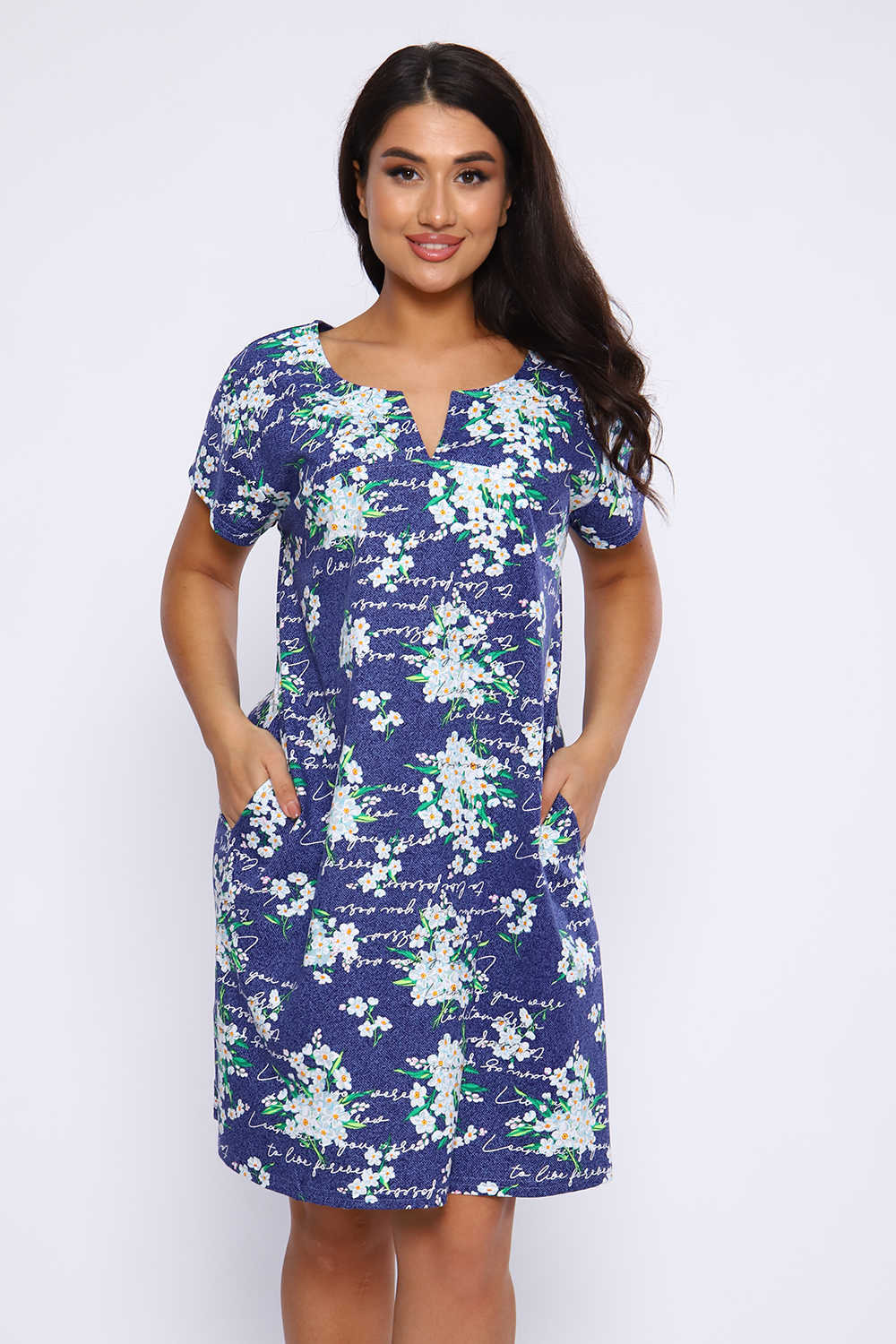 Женская туника из хлопковой ткани с красивой расцветкой. На полочке кокетка с разрезом, который очень интересно смотрится. По боковому шву карман, рукав короткий. Туника прекрасно подойдет для дома, дачи и отдыха.