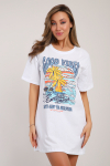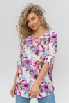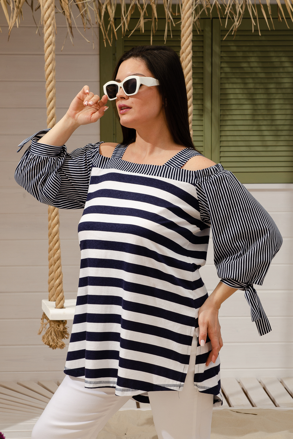Туника с открытыми плечами на широких бретелях, расширенная к низу, в боковых швах разрезы, рукав ниже локтя, по низу рукава сборка, манжета с завязками. Сочетание в тунике крупной и мелкой полосы придает изделию особую неповторимость, морской стиль особенно актуален для лета.