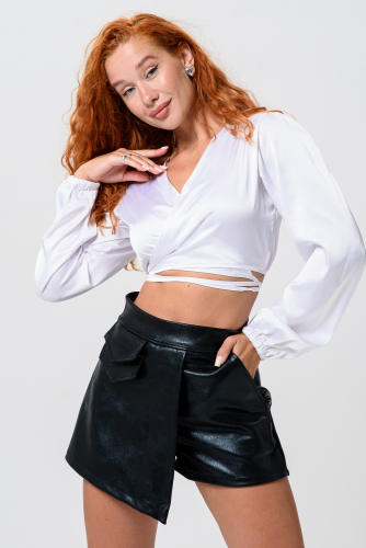 Туника полуприталенного силуэта, с V-образной горловиной, с разрезами в нижней части боковых швов. Рукав втачной, короткий, с декоративным вырезом. Горловина и рукава обработаны бейкой из основного полотна.