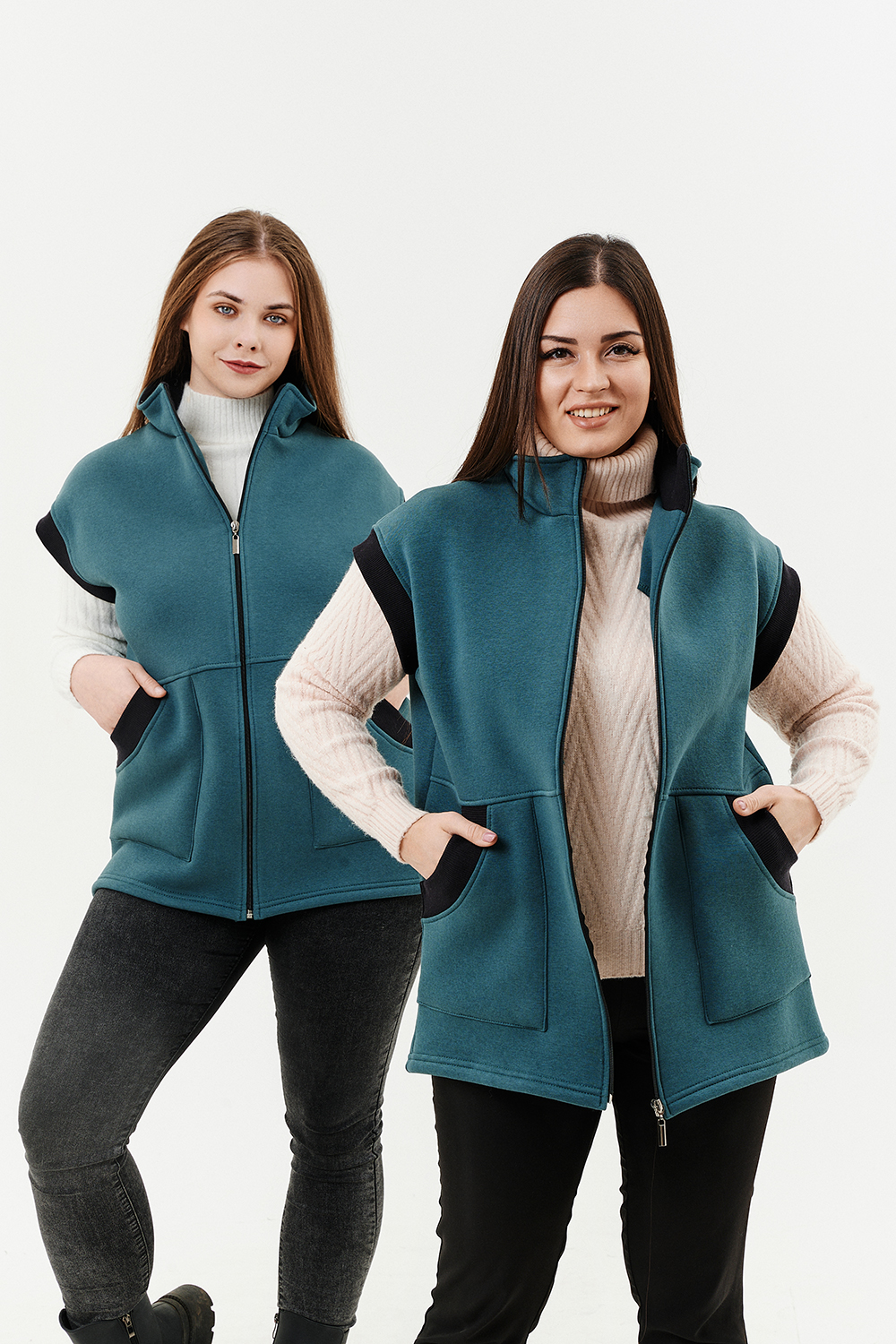 Жилет женский прямого силуэта. Застежка на тесьму - молнию. Воротник - стойка. На полочке два накладных кармана. Обтачки пройм, фигурного входа в карман и нижний воротник из кашкорсе контрастного черного цвета. Спинка немного длиннее полочки. Женщина в этом жилете будет выглядеть стильно и одновременно защищена от холода.