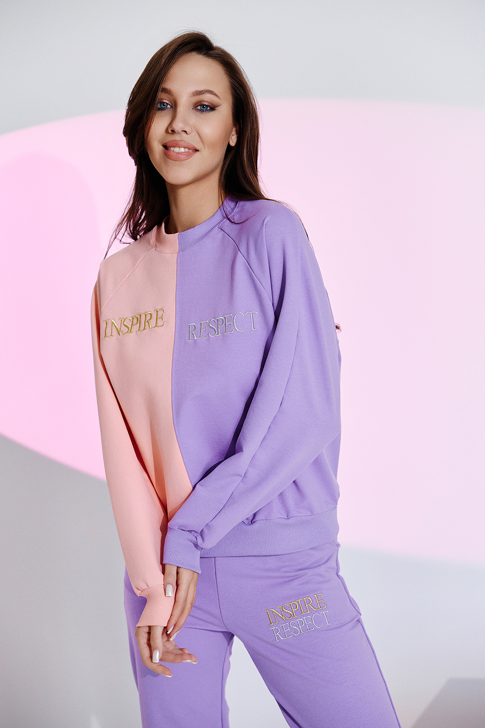 Толстовка женская свободного силуэта. Рукав реглан, свободный крой, контрастные ткани, яркая вышивка - все для стильного и современного образа. Цвет: сиреневый+персик; Материал: футер с лайкрой 2-х нитка;футер с лайкрой 2-х нитка; Состав: хлопок 72%, ПЭ 20%, эластан 8%.