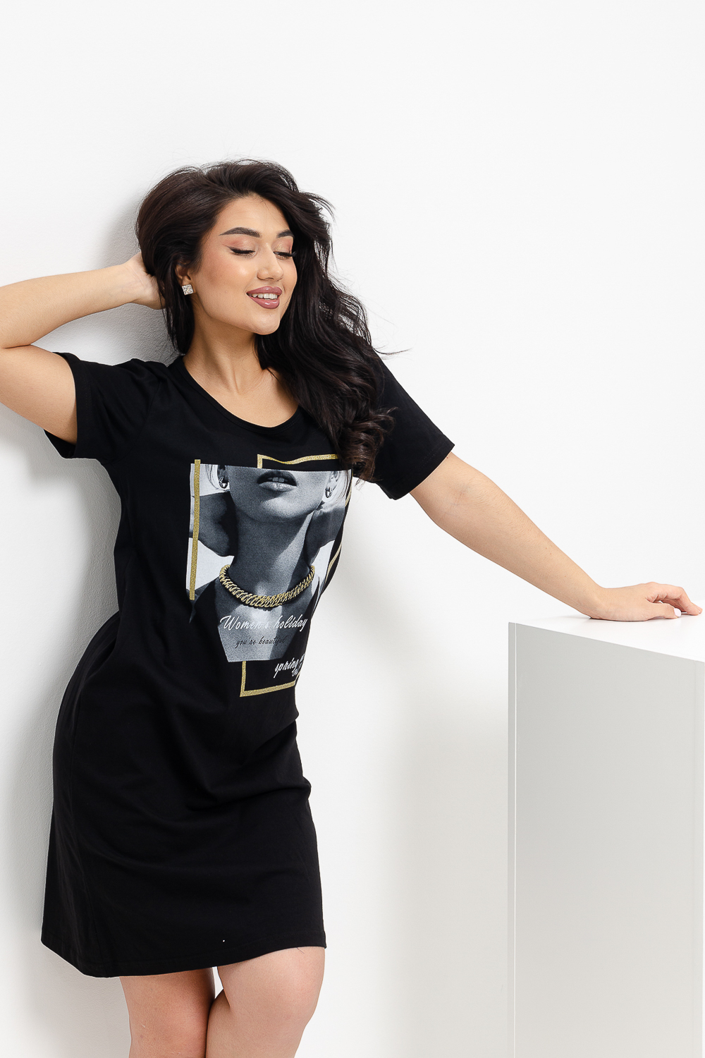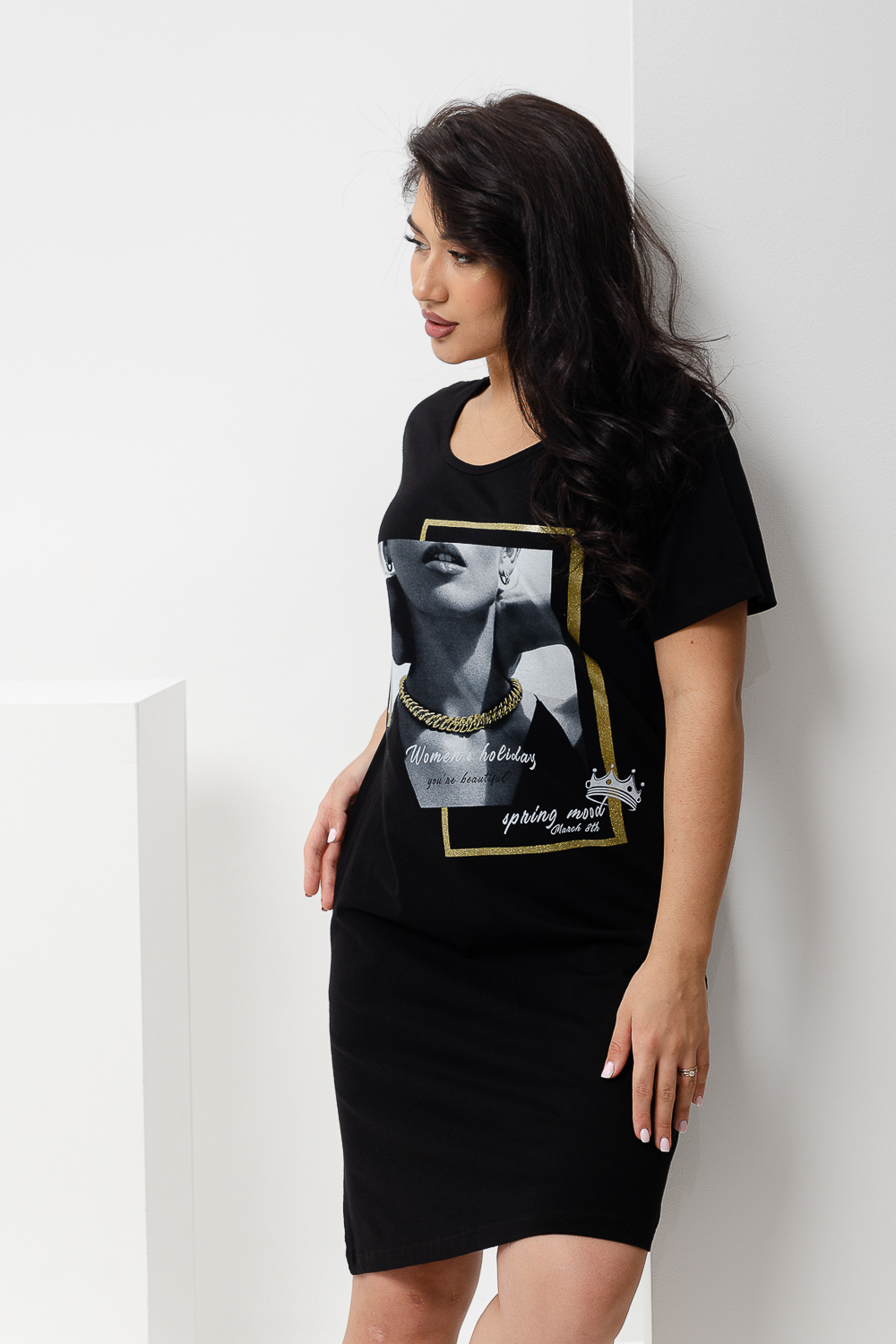 Туника слегка приталена, что создаёт красивый силуэт. Цвет тёмно-синий, почти чёрный, принт не резиновый, изделие мягкое. На 52-54 взяла 54 - сидит плотно, кто предпочитает свободную посадку берите на размер больше. Мой рост 165 длина туники ниже колена, модель видимо 175-180, на фото короче. Но мне так даже больше понравилось.