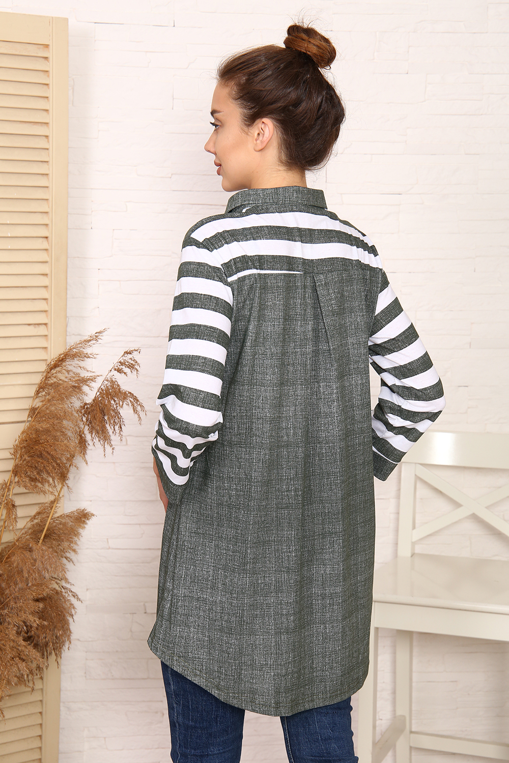 Женская туника-рубашка на пуговицах выполнена из хлопкового трикотажного полотна. Изделие свободного покроя с оригинальным комбинированием прекрасно подойдет для любителей комфорта в стильных вещах. Цвет: чёрно-белый;тёмно-зелёный; Материал: кулирка;кулирка; Состав: 100% хлопок.
