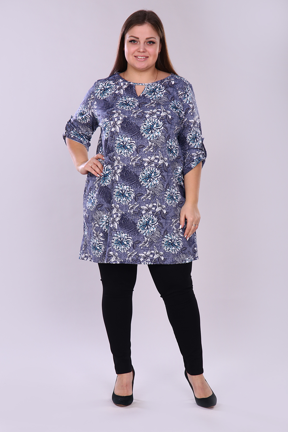 Удлинённая женская туника свободного кроя выполнена из 100% хлопчатобумажного полотна. По горловине расположен треугольный вырез, рукав 3/4. На рукавах имеются паты, закреплённые светлыми серебристыми пуговицами, что делает изделие более привлекательным. Данная туника для полноразмерных дам помогает скрыть недостатки фигуры и подчеркнуть достоинства, тем самым создавая стильный образ, в котором Вы будете чувствовать себя максимально комфортно и уверенно. На модели 52 размер