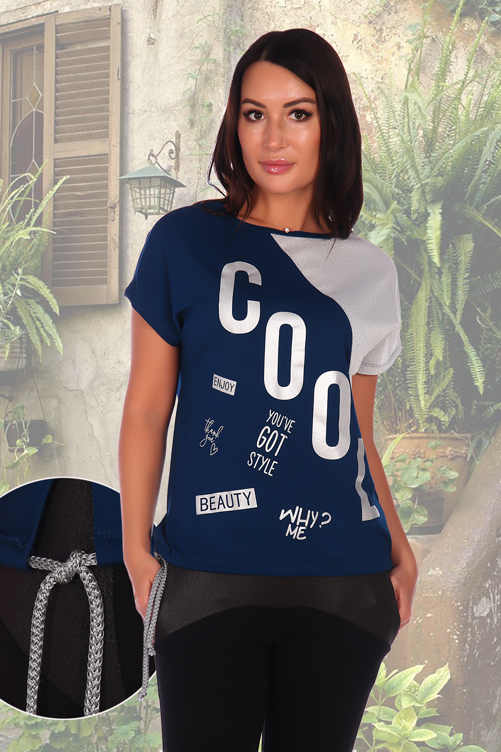 Туника свободного покроя со спущенным плечом выполнена из натуральной вискозы с отделкой из серебристого кашкорсе. На полочке напечатан принт серебром, который отлично сочетается с отделочной тканью. По низу изделия вставлен декоративный шнур-"канат". Туника приятная к телу, подходит для повседневной носки.