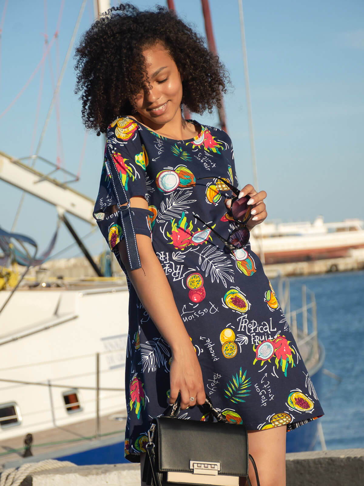 Женская туника А - образного силуэта с боковыми карманами выполнена из 100% хлопчатобумажного трикотажного полотна с тропическим рисунком. Горловина окантована, а интересный рукав с разрезом, металлическими полукольцами и декоративной лентой, позволяет создать изысканный образ, как в повседневной жизни, так и на отдыхе.