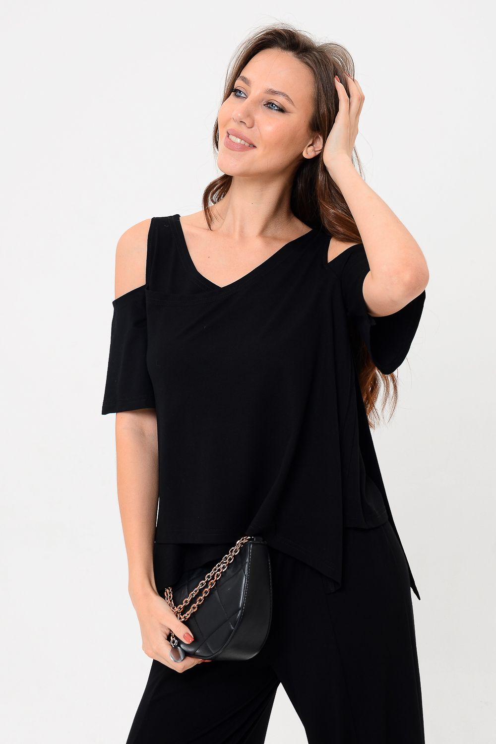 Дизайнерская женская блузка свободного кроя. Её можно носить как вечернюю или офисную, так же подойдет для жаркой погоды. Модель выполнена из приятной на ощупь дышащей ткани, не просвечивает. Особенностью блузки являются двойные полочка и спинка. Рукав с открытым плечом. Цвет: черный;белый;голубой; Материал: вискоза;вискоза; Состав: вискоза 92%, лайкра 8%.