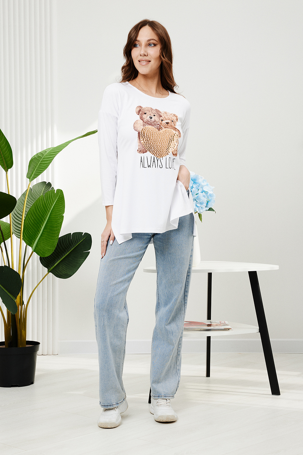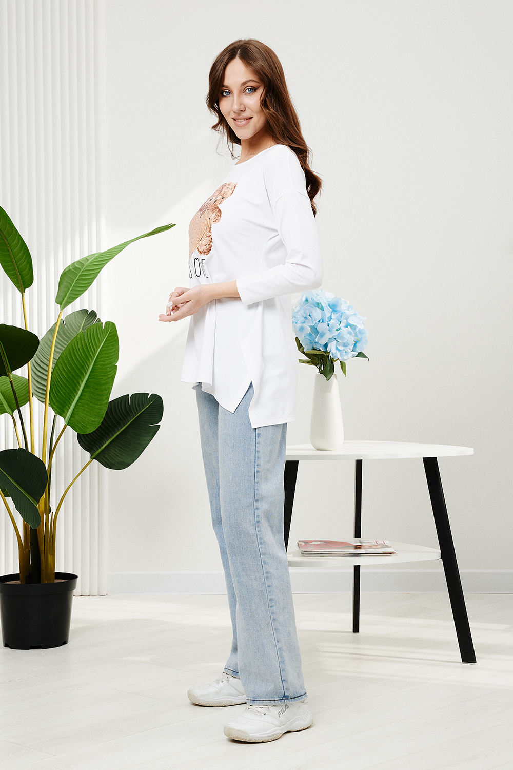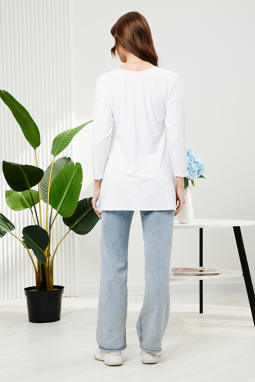Туника трапецивидного силуэта с расклешением от линии талии, с округлой горловиной, с фигурной линией низа, с разрезами в нижней части боковых швов. Спинка удлиненная. Рукав длинный. Горловина обработана бейкой из основного полотна. Цвет: белый; Материал: вискоза пенье;вискоза пенье; Состав: вискоза 92%, лайкра 8%.
