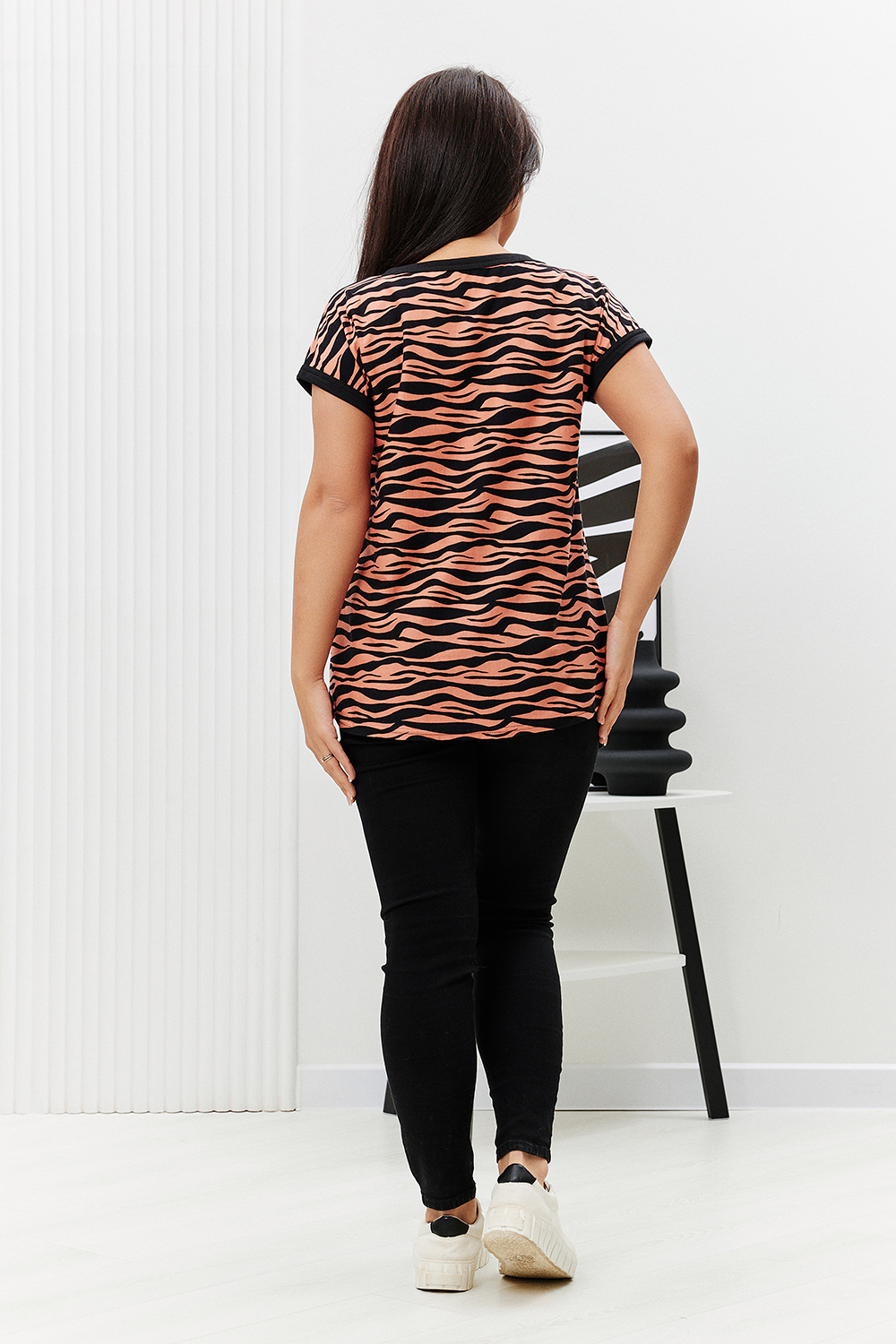Туника женская яркой оригинальной расцветки выполнена из кулирки 100% хлопок. Рукав спущенный, спинка длиннее переда на 4-5 см. Туника комфортная, идеально подойдет как для дома, так и для отдыха. Цвет: коричневый; Материал: кулирка;кулирка; Состав: 100% хлопок.