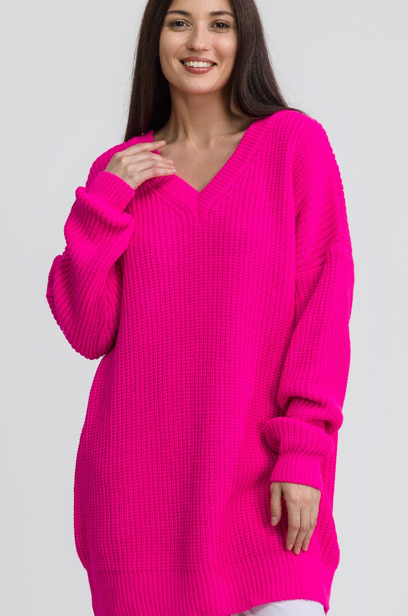 Свободный крой, актуальный цвет и стильные акценты – идеальный рецепт современного базового свитера. Женский удлиненный свитер оверсайз с V-образным вырезом подчёркивает ключицы, аккуратно открывает шею, раскрывая изящность своей обладательницы. Благодаря крою и минималистичному дизайну однотонный малиновый свитер надолго сохранит свою актуальность. Женская кофта one size подходит девушкам с любым типом фигуры.
