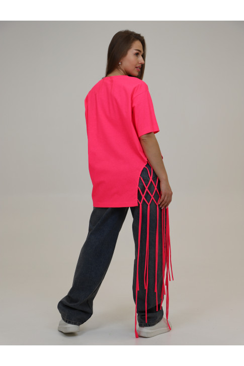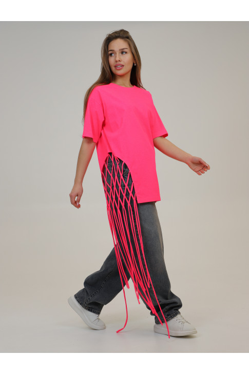 Яркая удлиненная футболка с декоративным плетением. Выполнена из 100% хлопка.
