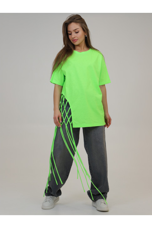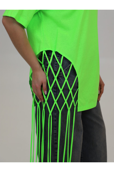 Яркая удлиненная футболка с декоративным плетением. Выполнена из 100% хлопка.