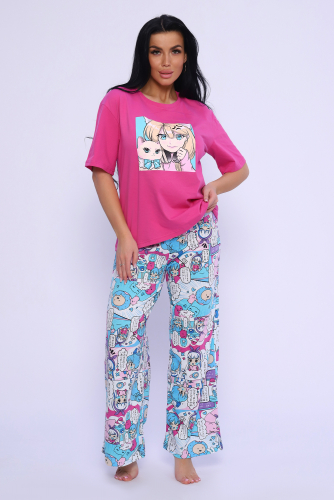Домашний костюм с брюками и свитшотом с рукавом 3/4 выполнен их мягкого трикотажа на основе 100% хлопка. Материал не теряет форму после стирки и долго сохраняет яркость рисунка. Футболка с рукавом 3/4, брюки прямого кроя на манжетах.