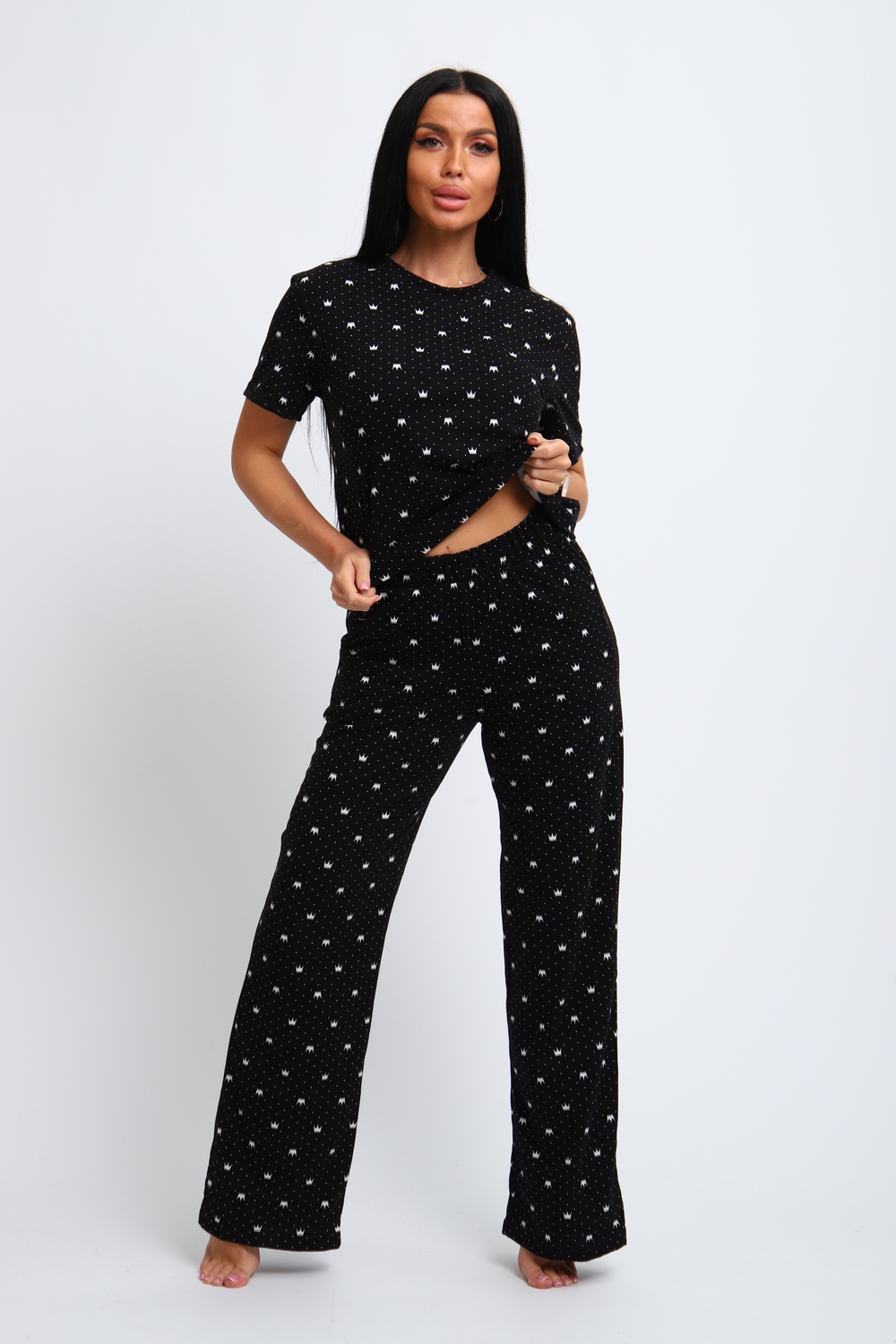 Пижама женская футболка и брюки. Брюки прямого кроя, с карманами. Футболка с коротким рукавом. Цвет: черный; Материал: кулирка; Состав: 100% хлопок.