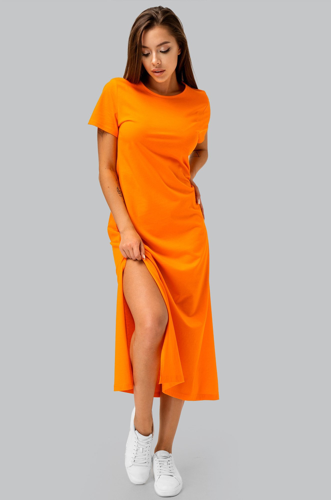 Однотонное оранжевое платье миди подходит для дома. Трикотажное свободное платье подойдет на каждый день.