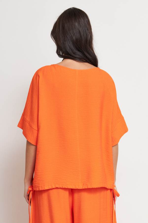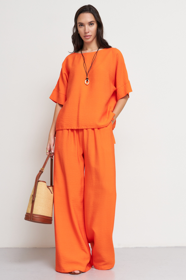 Блуза из вискозной ткани с крэш-эффектом. Очень свободный силуэт с небольшими разрезами по бокам. Круглый вырез горловины. Цельнокроеный рукав с притачной манжетой. Низ изделия затягивается на кулиску.