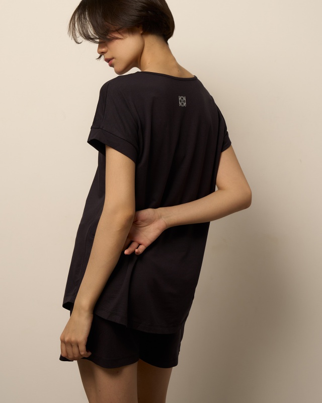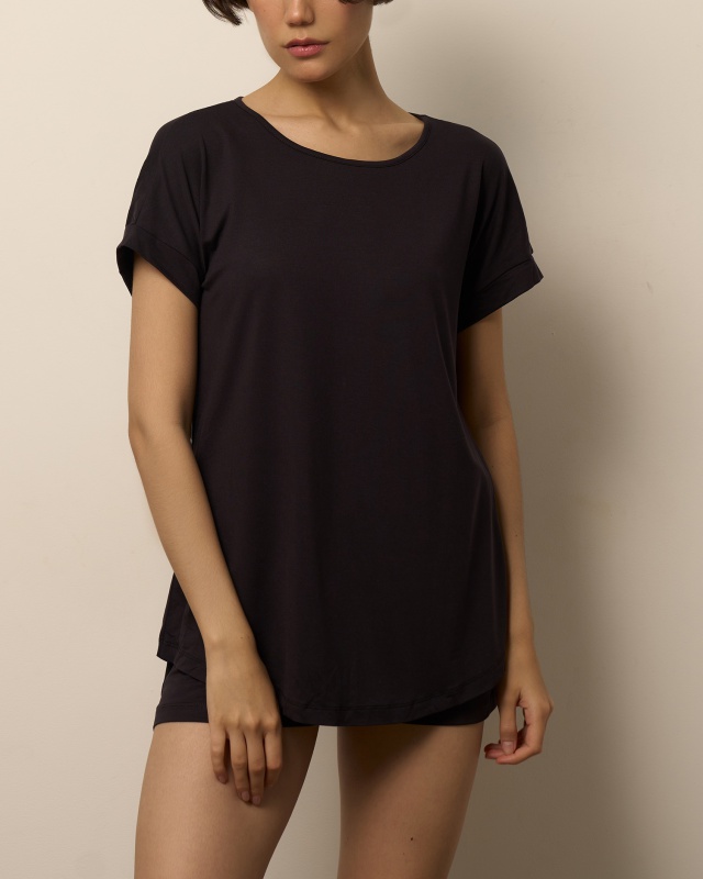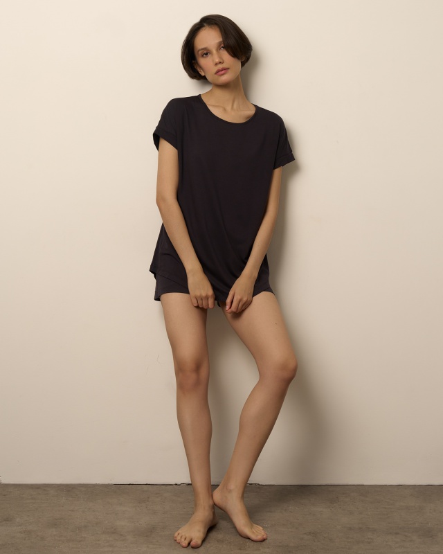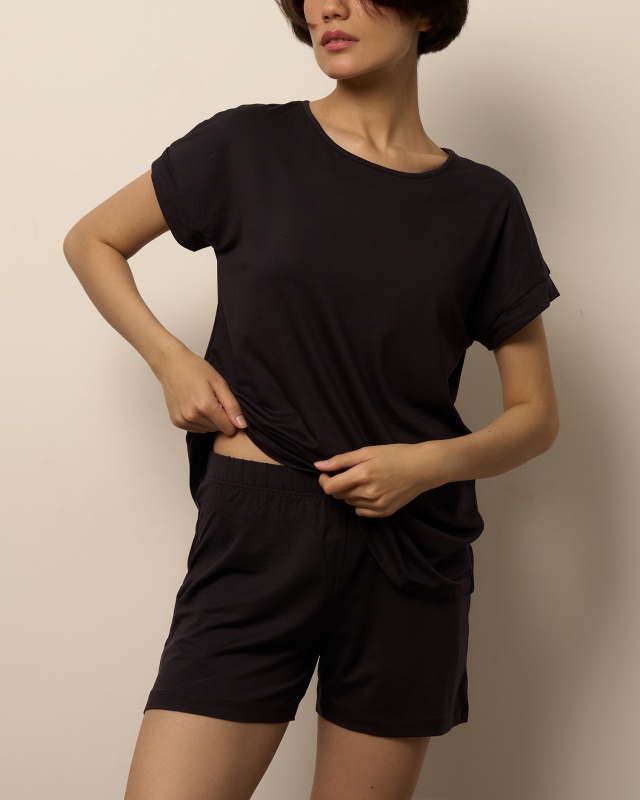 РОЗНИЧНАЯ ЦЕНА 3984руб. Футболка свободного кроя с фигурным низом и манжетами. шорты свободного кроя, средней длины с разрезами Состав: МИКРОМОДАЛ 95%; ЭЛАСТАН 5%