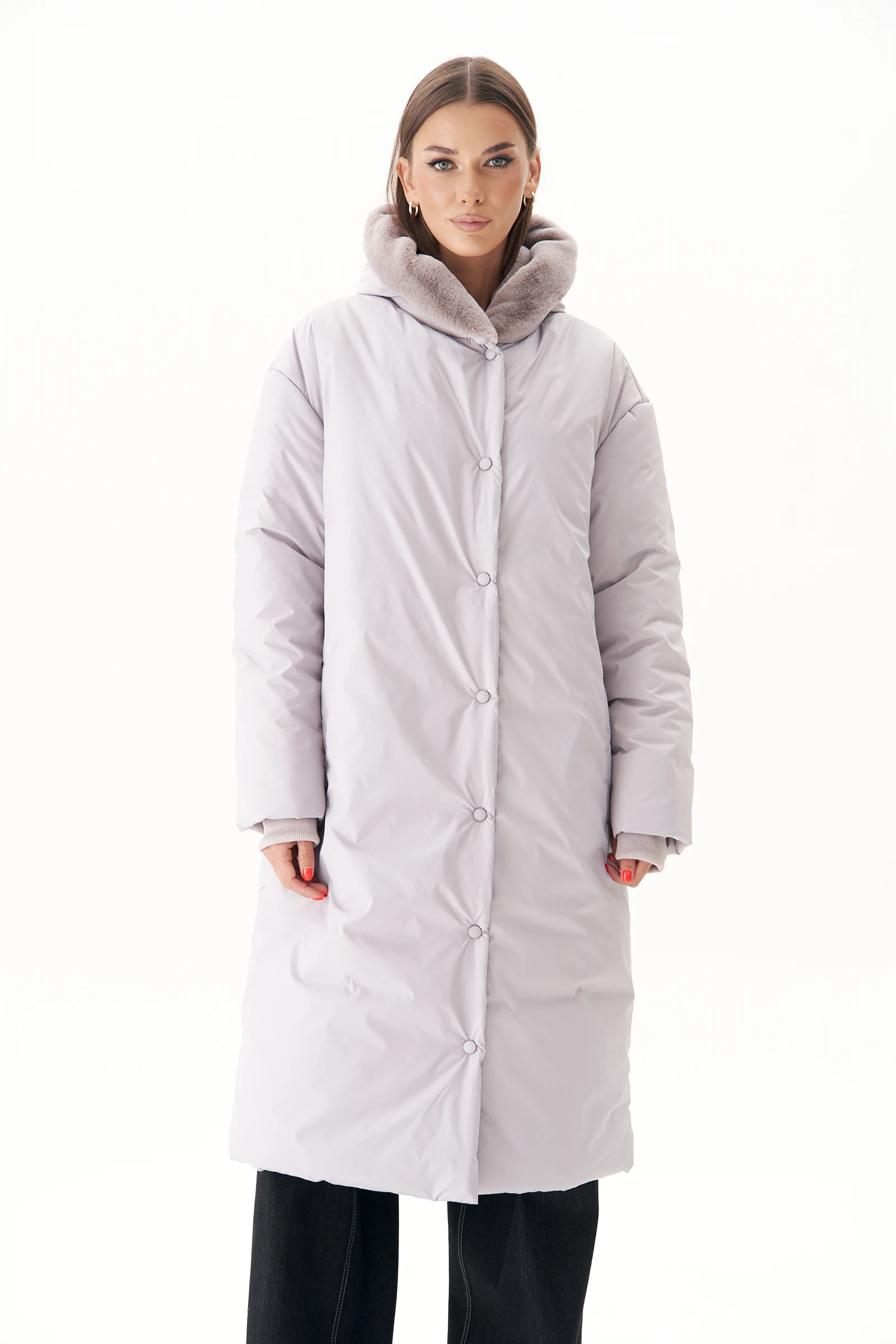 Элегантное, женственное и эффектное. Это пальто было популярно и в прошлые сезоны, но в коллекции 24-25 г. занимает одно из первых мест. Современный, свободный силуэт с заниженной линией плеча, втачной рукав, расширенный в области оката, центральная застёжка на тесьму молнию и цельнокроеную с полочкой планку, расстёгивающуюся на отдельные кнопки, воротник-капюшон с отделкой мехом.