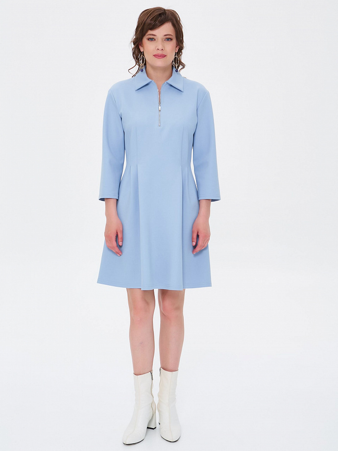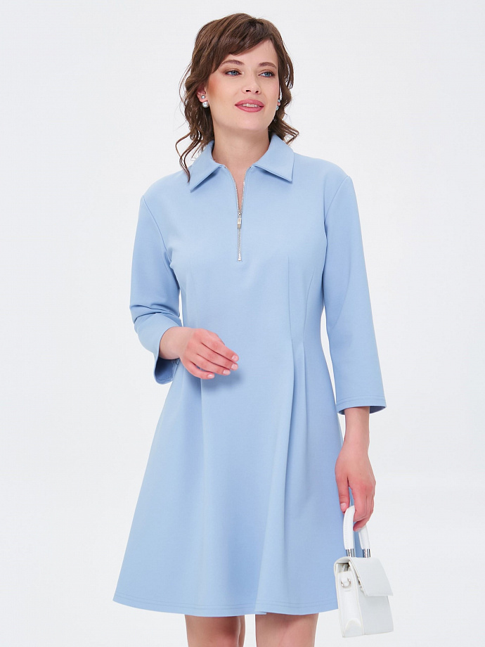 Модель со спущенным плечом и рукавом длиной 3/4. Воротник отложной. Спереди застёжка на металлическую молнию. Вытачки по талии переходят в мягкие складки.