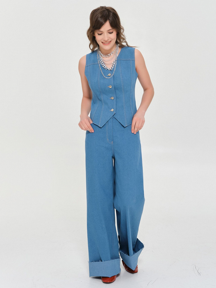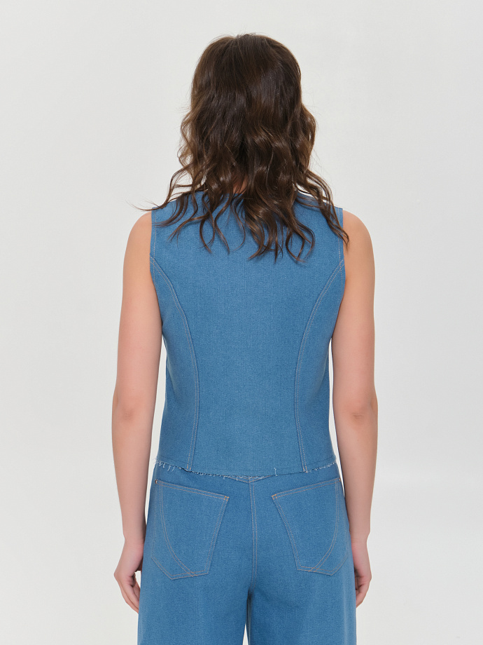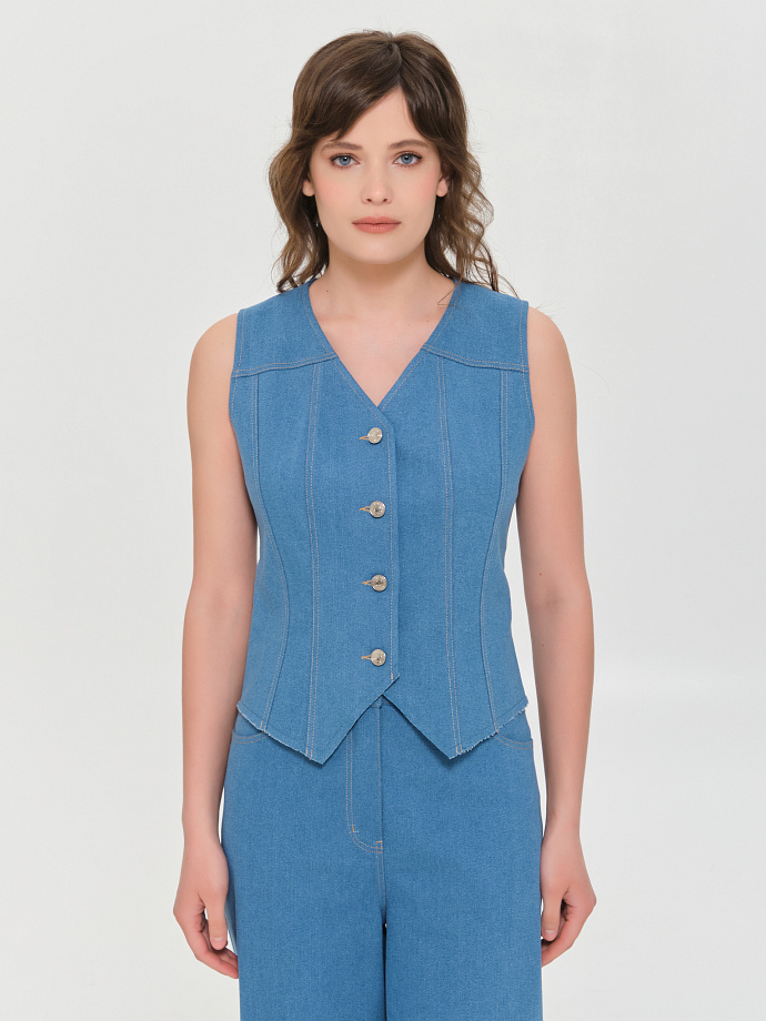 Модель полуприлегающего силуэта, без подклада. Перед с кокетками, рельефами и центральной застёжкой на петли и пуговицы. Спинка с рельефами. Вырез горловины V-образной формы. Жилет декорирован  отделочными строчками. Низ изделия фигурный,с необработанными срезами.