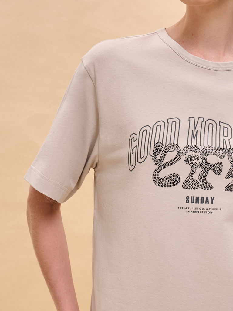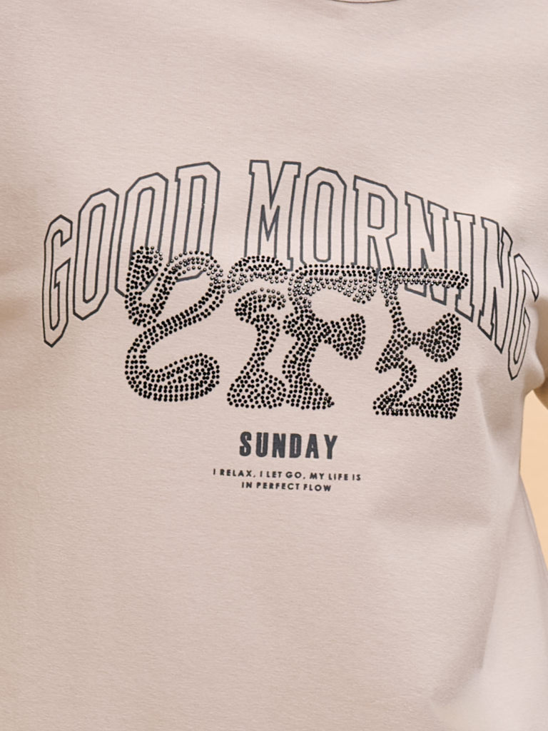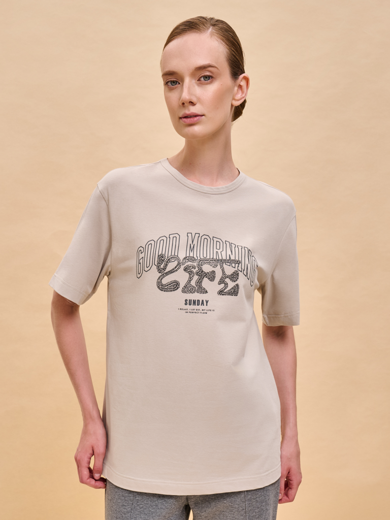 Женская футболка с принтом среднего объёма с коротким прямым рукавом. Вырез горловины обработан окантовкой. Изделие неприхотливо в уходе. Хлопковая футболка женская украшена принтом + актуальной аппликацией из мелких матовых страз. Шрифты в трендовых университском и футуристическом стилях. Надписи переводятся: «доброе утро, жизнь», «воскресенье», «я расслабляюсь, я отпускаю всё, моя жизнь течёт своим чередом». Принт и аппликация устойчивые, прочные, хорошо переносят многочисленные стирки. В составе ткани преобладает высококачественный хлопок — майка мягкая, воздухопроницаемая, приятная на ощупь. Футболка с надписями выполнена в трендовых и при этом универсальных цветах, которые отлично сочетаются с различными брюками, шортами. Футболки с принтом женские подходят также девушкам, девочкам-подросткам. Хлопковая футболка идеальна для любого времени года, её можно носить как летом, так и в холодное время года в качестве среднего слоя одежды, а также на спорт. Помните о правильном уходе за изделием: рекомендуется стирать при температуре не выше 30 °C, без предварительного замачивания, с изнанки. Это поможет сохранить качество и цвет футболки на длительное время. Не забывайте о выборе правильного размера. Используйте таблицу размеров на фотографии, чтобы выбрать подходящий для себя вариант. Обратите внимание, что цвет товара на экране вашего устройства может отличаться от реального. Состав: 95%хлопок 5%эластан Возрастная группа: Standard Сезон: Осень Год: 2024 Пол: Женщины