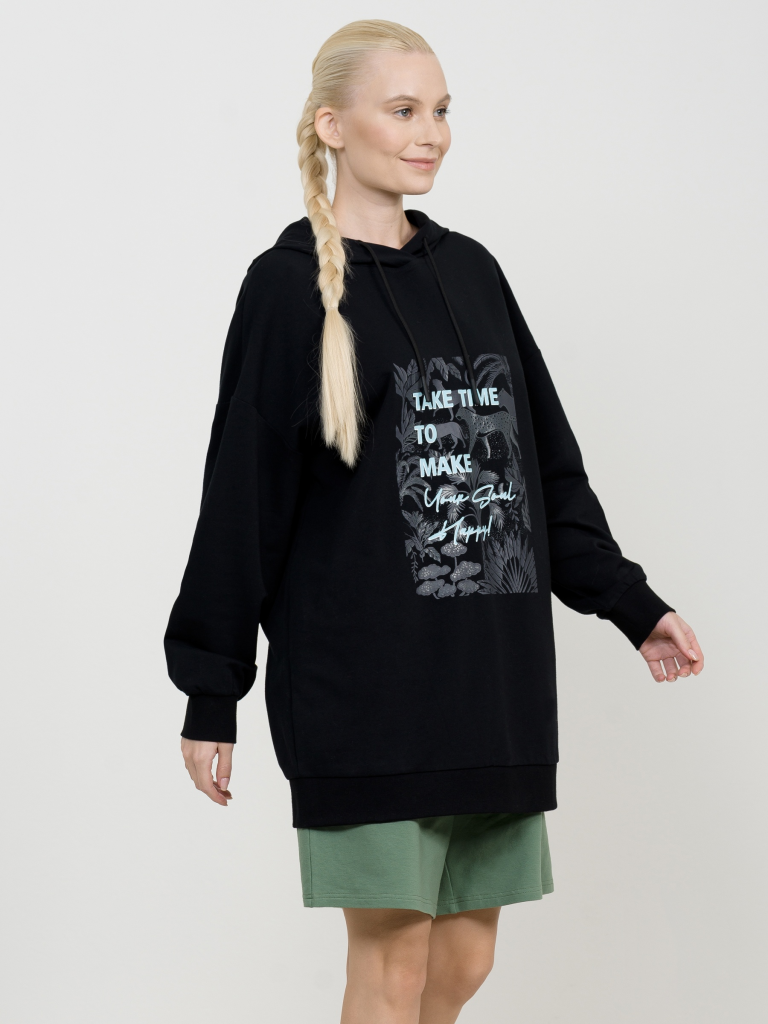 Удлиненное худи большого объема с эластичным принтом с глянцем. Манжеты по низу рукава и низу изделия из рибаны. Объем капюшона регулируется шнурком черного цвета. Перевод Найдите время, чтобы сделать свою душу счастливой._x000D_