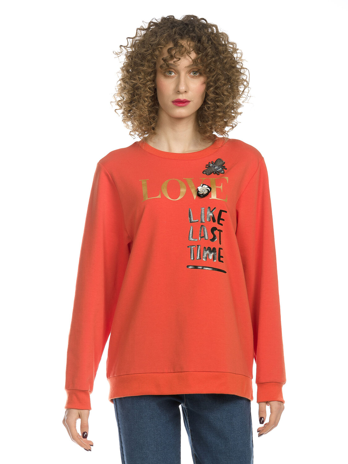 Толстовка женская. Увеличенный объем. Горловина и манжеты из рибаны. НОВИНКА в декоре: объемные нашивки - 3D-цветок из пайеток с крупным камнем и фактурная пчела со стразами и бисером - надежно пришиты к основе. Не линяют при стирке. Шрифт выполнен золотом и черным глянцем. Перевод: "Люби как последний раз".