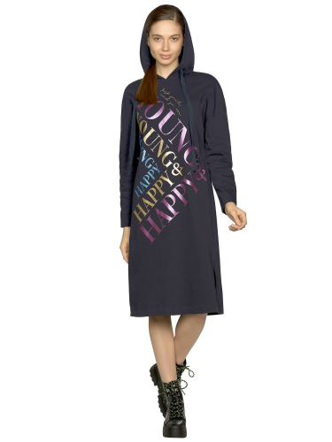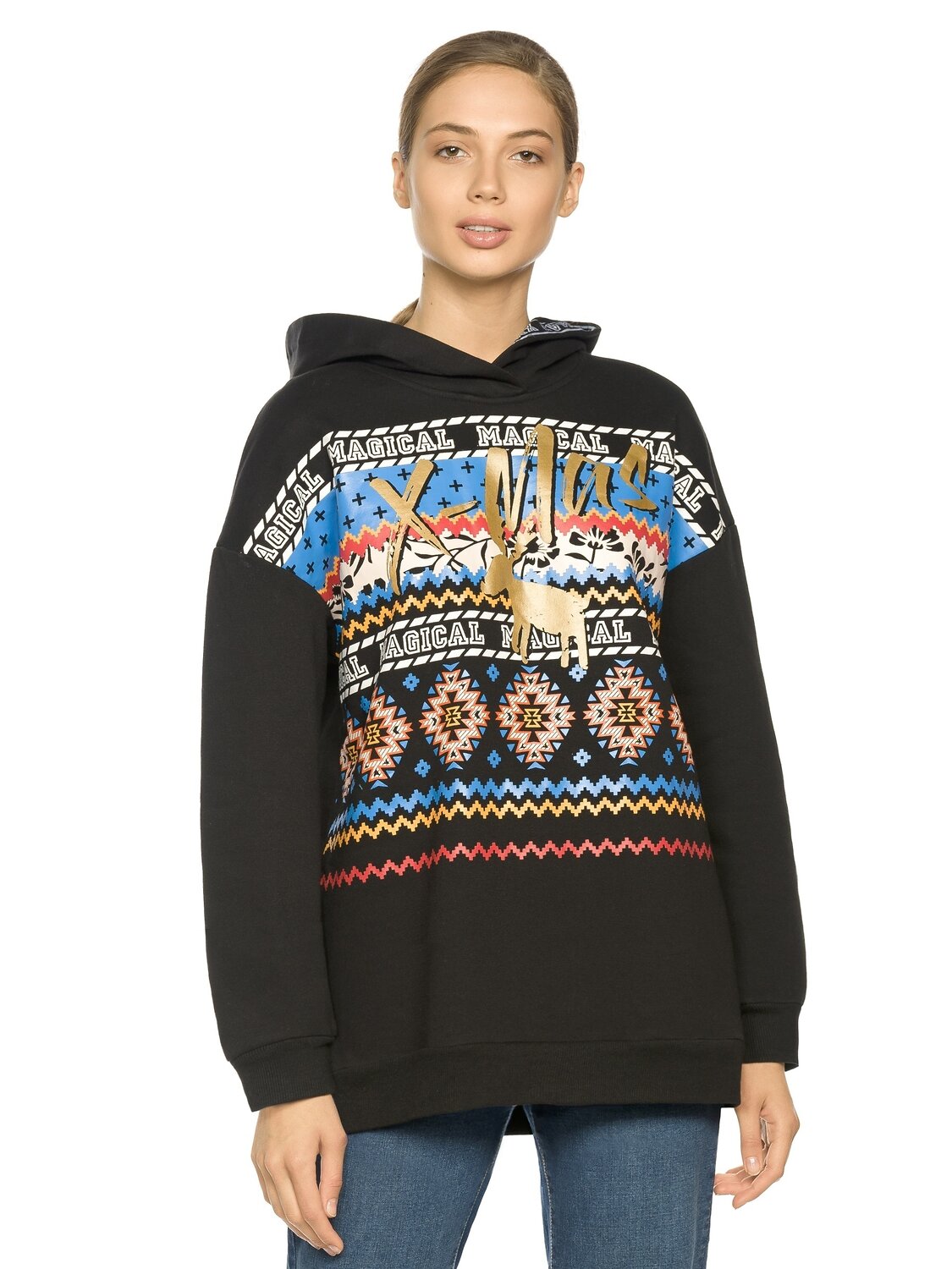 Утеплённое худи, уютный увеличенный объём. Футер с начесом. Капюшон с декоративной тесьмой с вытканным рисунком и настроченной внутри, перевод Рождество. Линия плеча спущена, манжеты по низу рукавов и изделия из рибаны. Небольшой перепад длин между передом и спинкой. Стойкий и эластичный rubber принт с золотым металликом, перевод Волшебное Рождество.