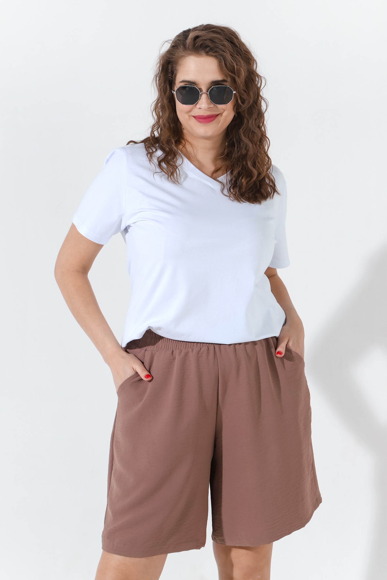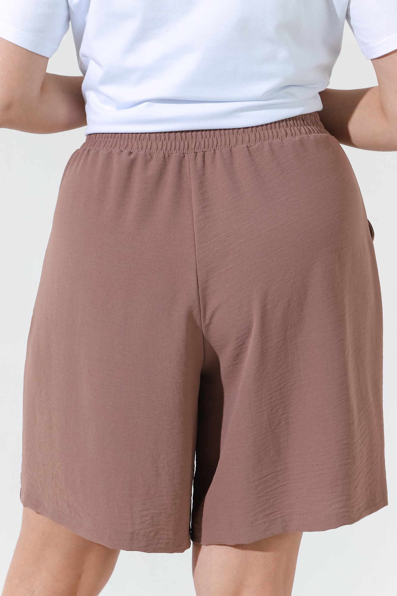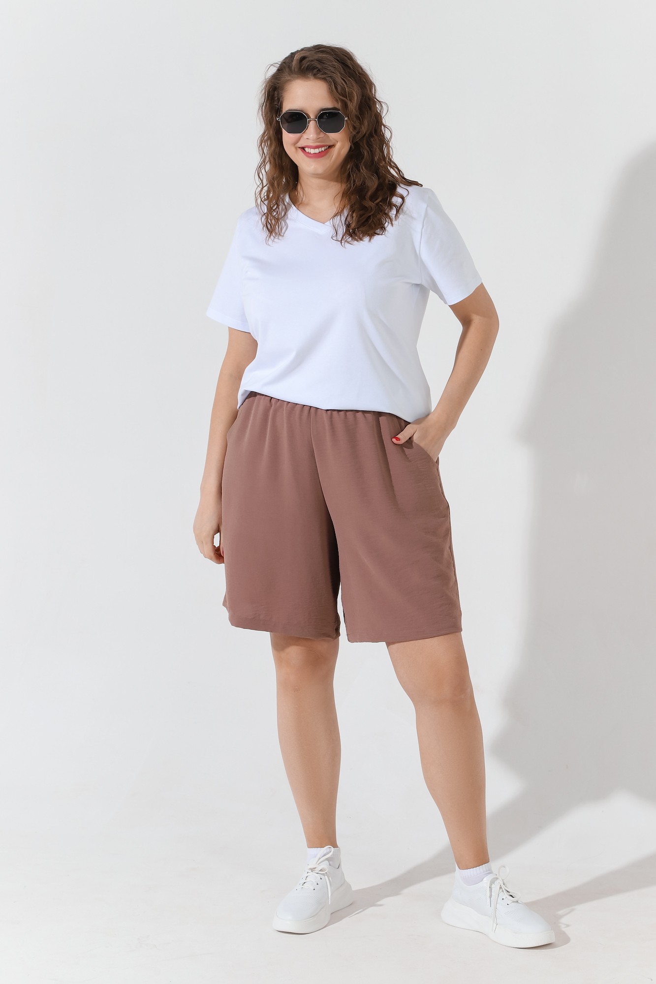 Шорты женские из тканого гладкокрашеного полотна «Лен Манго», свободного покроя средней длины, с карманами в боковых швах, на притачном поясе с эластичной тесьмой внутри.