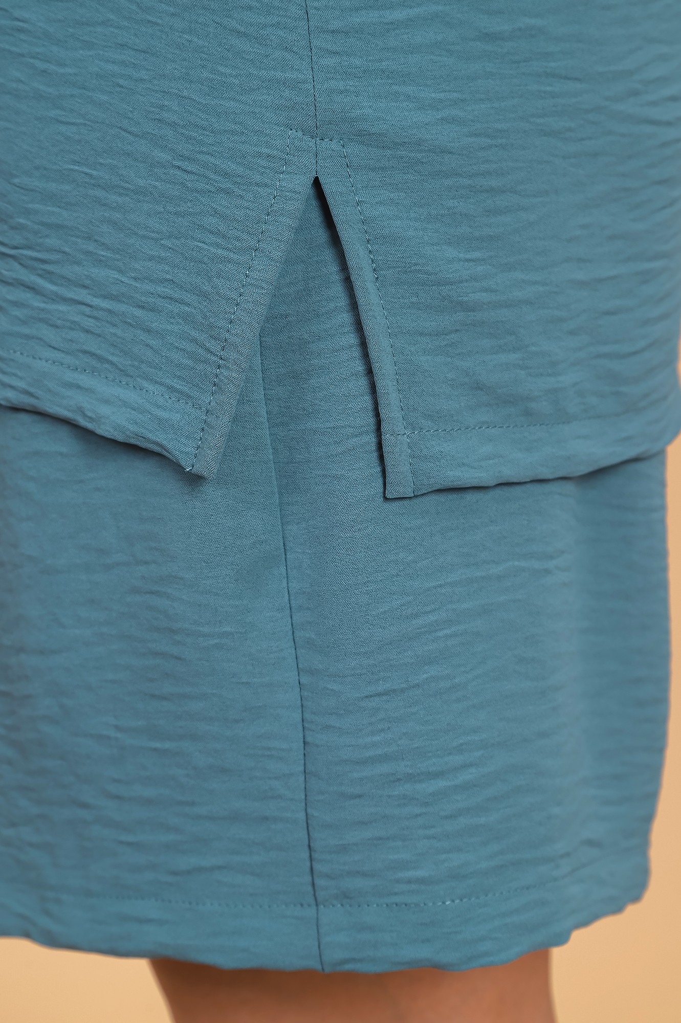 Блуза (рубашка) женская из тканого гладкокрашеного полотна «Лен Манго», свободного покроя, с короткими втачными рукавами, стояче-отложным воротником, центральной бортовой застежкой на обметанные петли и пуговицы. В боковых швах разрезы.