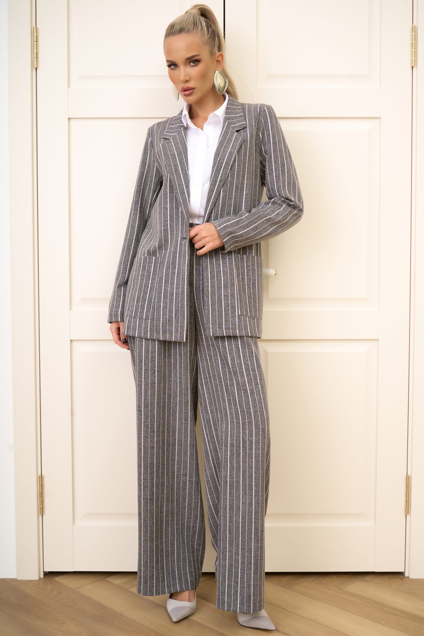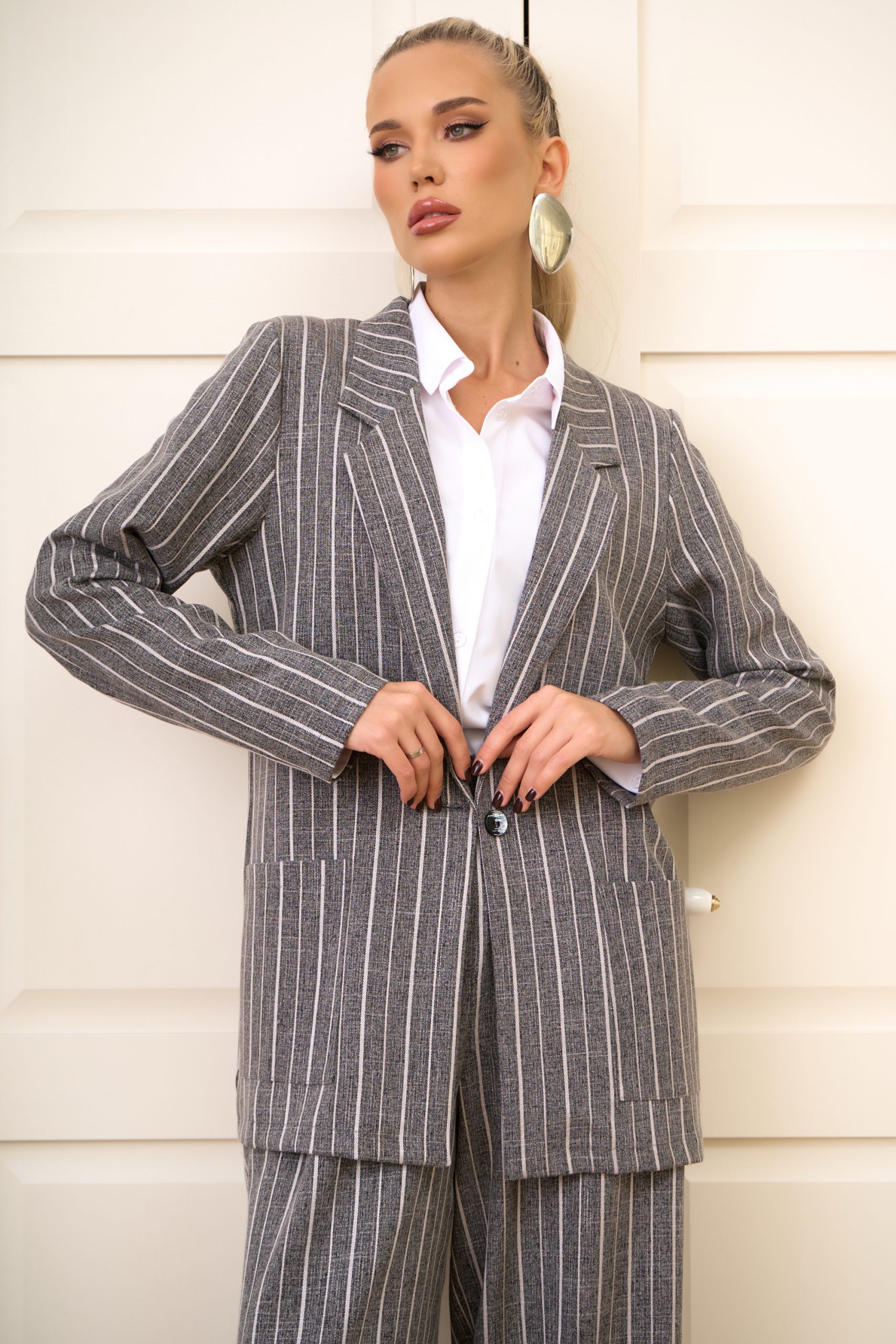 Серый пиджак в тонкую белую полоску — это воплощение современного минимализма с элегантной структурой. Лёгкая ткань идеально держит форму, а прямой силуэт визуально вытягивает фигуру, создавая аккуратный и стильный образ. Пиджак легко комбинируется с различными низами, а его длина и посадка продуманы так, чтобы было удобно подобрать точный размер.