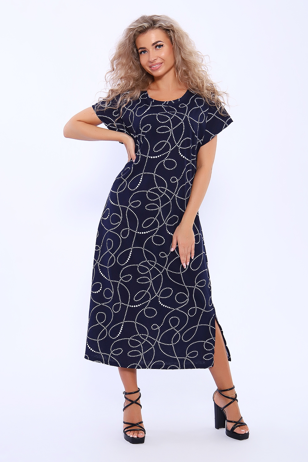 Платье свободного кроя со спущенными плечами, карманами и разрезами в боковых швах.