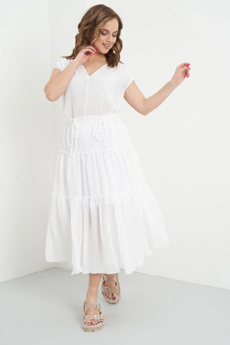 Нет предмета женской одежды более женственного и более универсального чем платье. Немного смелости: попробуйте, примерьте и, непременно, вы оцените новое белое платье-сарафан, ведь это супертренд лета. Белая одежда отражает наше стремление к простоте, заставляет нас мечтать о безмятежном отдыхе, а благодаря несложным стилевым решениям это ещё и супермодно. Лёгкая дышащая ткань с эффектом жатости, хб подкладка, оригинальные кружевные вставки на плечах, -образный вырез, регулируемая кулиса и эффектные разрезы-шлицы по нижнему волану. Длина платья 85 см от линии талии.