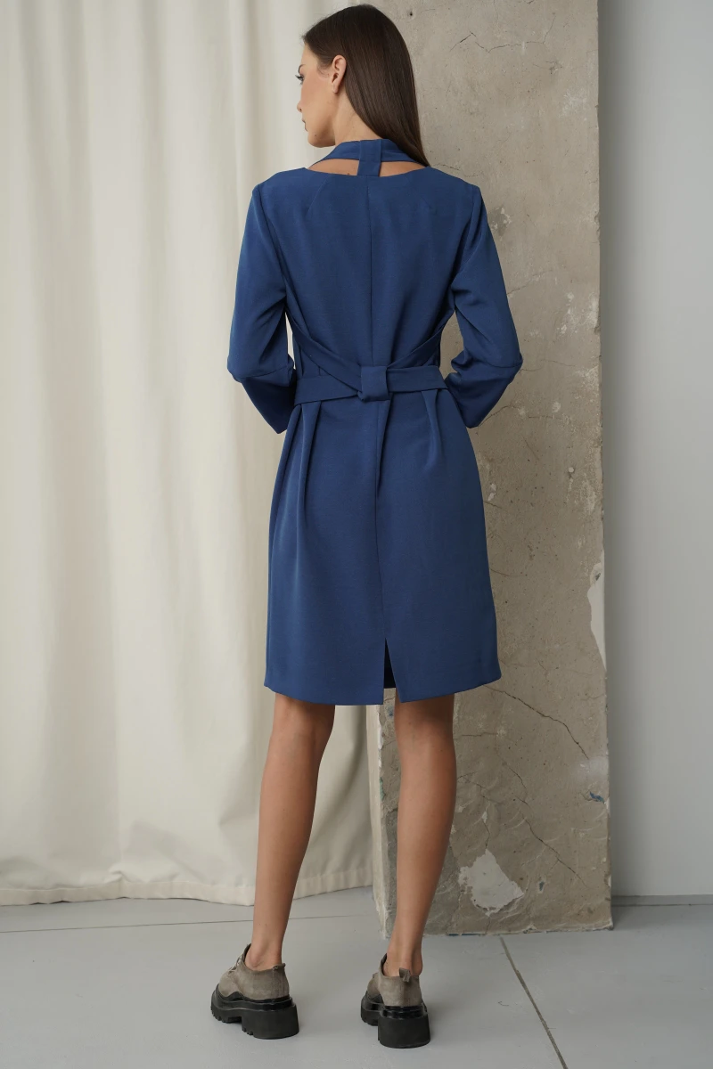 Даже если женщина предпочитает спортивный стиль, в её гардеробе обязательно найдётся хотя бы одно платье. И хорошо, когда это платье универсальное, удобное, носить которое можно в разных вариантах, подходящее для разных мероприятий, меняющее образ своей обладательницы в зависимости от настроения. Предлагаем вам обратить внимание на такое платье силуэта в базовом цвете. Платье с втачными рукавами длиной 34 с локтевой вытачкой. Вырез горловины овальной формы. По переду - нагрудные вытачки. Спинка с центральным швом и плечевыми вытачками, идущими из линии горловины. По центру горловины спинки - отделочная пата, через которую продевается съёмный декоративный пояс, застёгивающийся спереди на серебристую пряжку. Длина платья по спинке около 92 см. Длина рукава около 48 см.