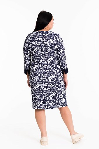 Женское платье выполнено из полотна академик. Горловина имеет круглый вырез, рукава длинные. В качестве отделки однотонные вставки из отделочного полотна.