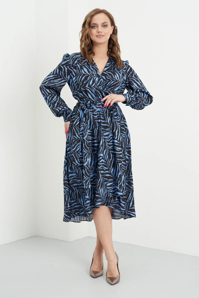 Воздушный летящий образ дарит шёлковое платье с запахом. Стильное платье облагораживает нотками лёгкости, женственности и утончённости женский силуэт.Платье свободного силуэта, отрезное по линии талии с имитацией запаха и -образным вырезом горловины.На верхней части переда две нижние складки от плеча и сборка по линии талии. Нижняя часть платья конической формы с ассиметричной линией низа.Рукава втачные с лёгкой сборкой по окату и притачными манжетами, застёгивающимися на одну пуговицу. По линии притачивания манжеты сборка.Линия талии фиксируется эластичной тесьмой. Платье дополнено широким съёмным поясом, завязывающимся на бант. Пуговицы в виде страз.Длина по средней линии спинки около 116 см, длина рукава около 62 см.