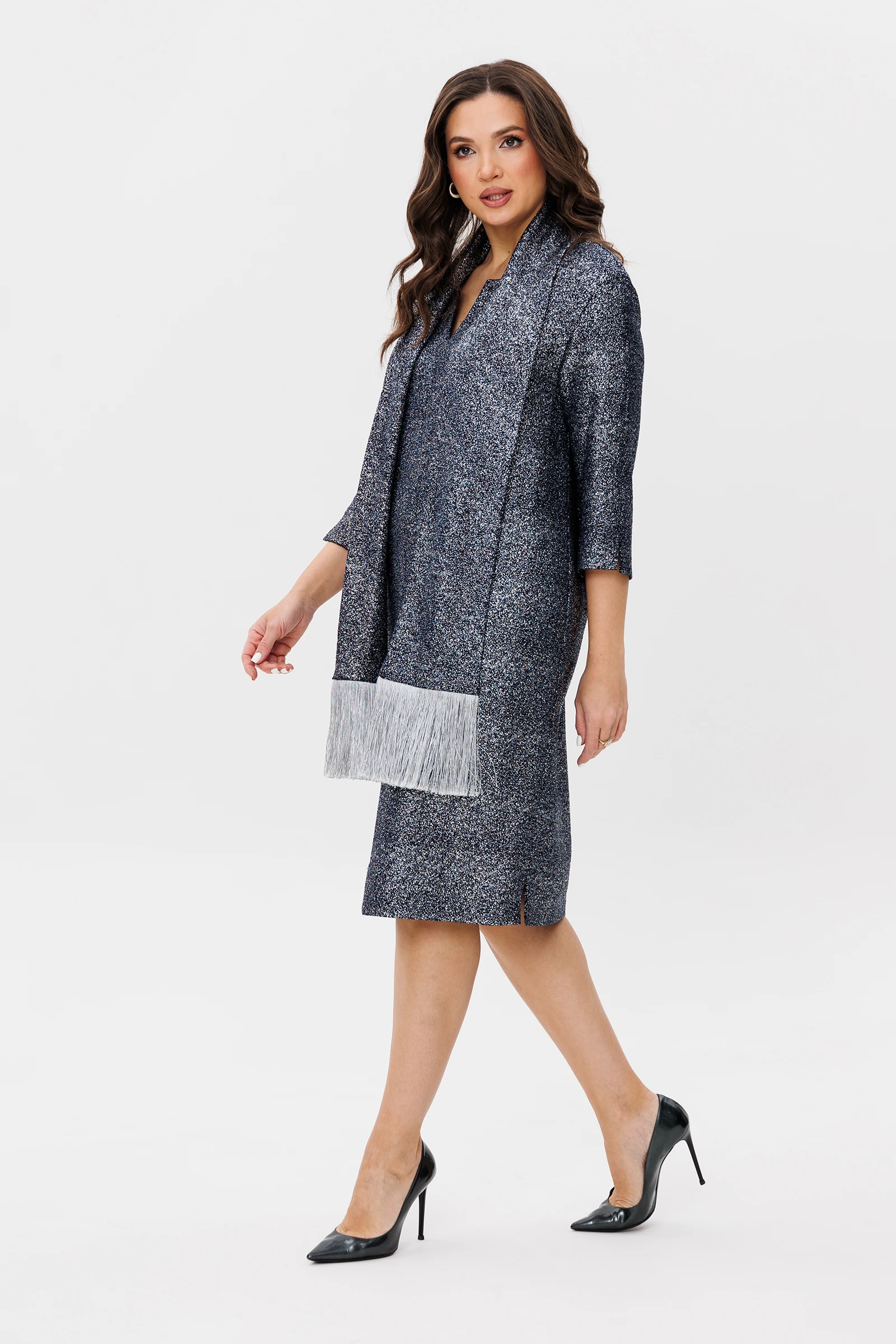 Сверкающие металлизированные поверхности-проверенный способ не остаться незамеченной.Серебренное напыление поддержанное эффектной бахромой, в лаконичном платье шифт длины миди, отличный выбор для праздничного настроения.Свободный упрямлённый силуэт со слегка заниженной линией плеча. Полочка с центральным швом и декоративным разрезом горловины. Спинка с центральным швом. Рукав двухшовный с разрезом в переднем шве.Воротник-шарф, косого кроя с отделочной бахромой. По боковым швам-небольшие разрезы.Длина платья около 107 см.Длина рукава с плечом около 62 см.