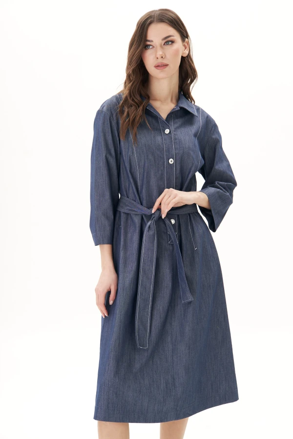 Платье полуприлегающего силуэта, втачного покроя, с рубашечным воротником на цельнокроеной стойке. Полочка с вертикальными рельефами и частичной застежкой на петли и пуговицы. По боковым швам - карман с листочкой. Спинка с отрезной кокеткой, срезным швом и вертикальным частичным рельефом. Модель дополнена съемным поясом. Все конструктивные элементы подчёркнуты отделочными контрастными строчками.Длина платья 107 см. Длина рукава 48 см.
