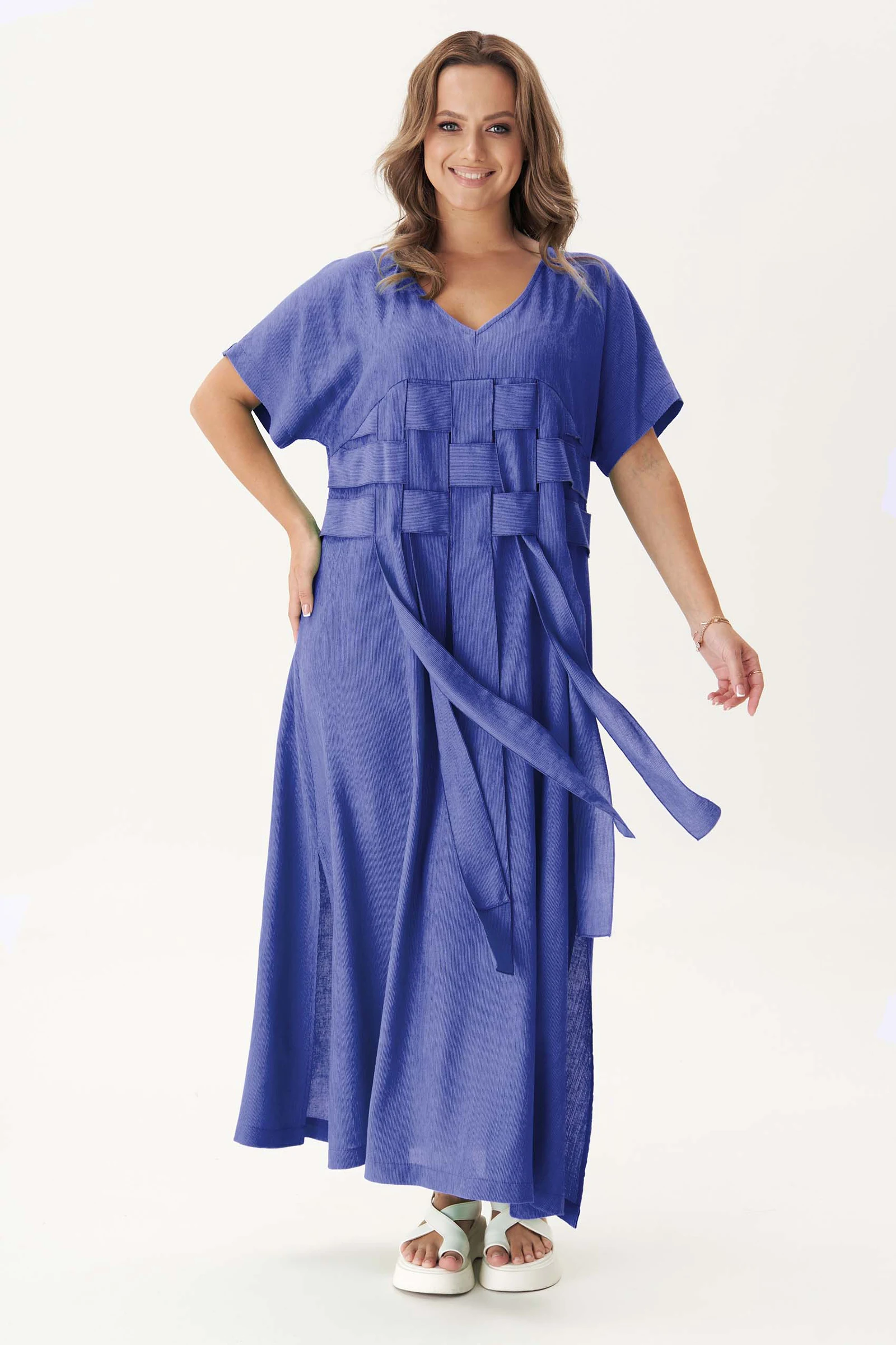 Вжух… И платье взлетело. Летом хочется уйти от официоза!Свободное, многослойное, из натуральной вискозы с авторской декорацией из плетёных полос - это не платье … это мечта!Свободный А-силуэт, цельнокроеный рукав, -образный вырез.Полочка с фигурной кокеткой и плетением из лент. Спинка с фигурной кокеткой, средним швом и повторяющим полочку плетением. По боковым швам - разрезы.Длина платья около 132 см.Длина рукава с плечом около 36 см.