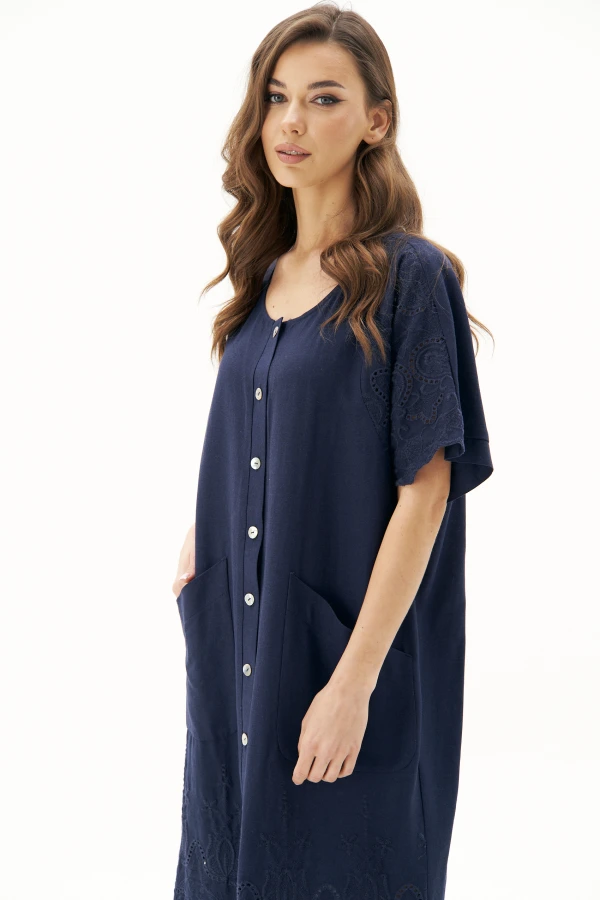 Это платье не оставит вас незамеченной ни в одной ситуации. Эффект, который оно производит, заслуживает того, чтобы обязательно включить такую модель в свой повседневный гардероб. Простота кроя - секретный код, которым обладает это платье. Силуэт свободный, расширенный, покрой - цельнокроенный, застёжка центральная на пуговицы. Полочки с накладными большими карманами, спинка с отрезной кокеткой, цельнокроенной с рукавом, и средним швом. По боковым швам - разрезы. Кокетка полочки и спинки из отделочной ткани. Длина платья около 105 см. Длина рукава с плечом около 40 см.