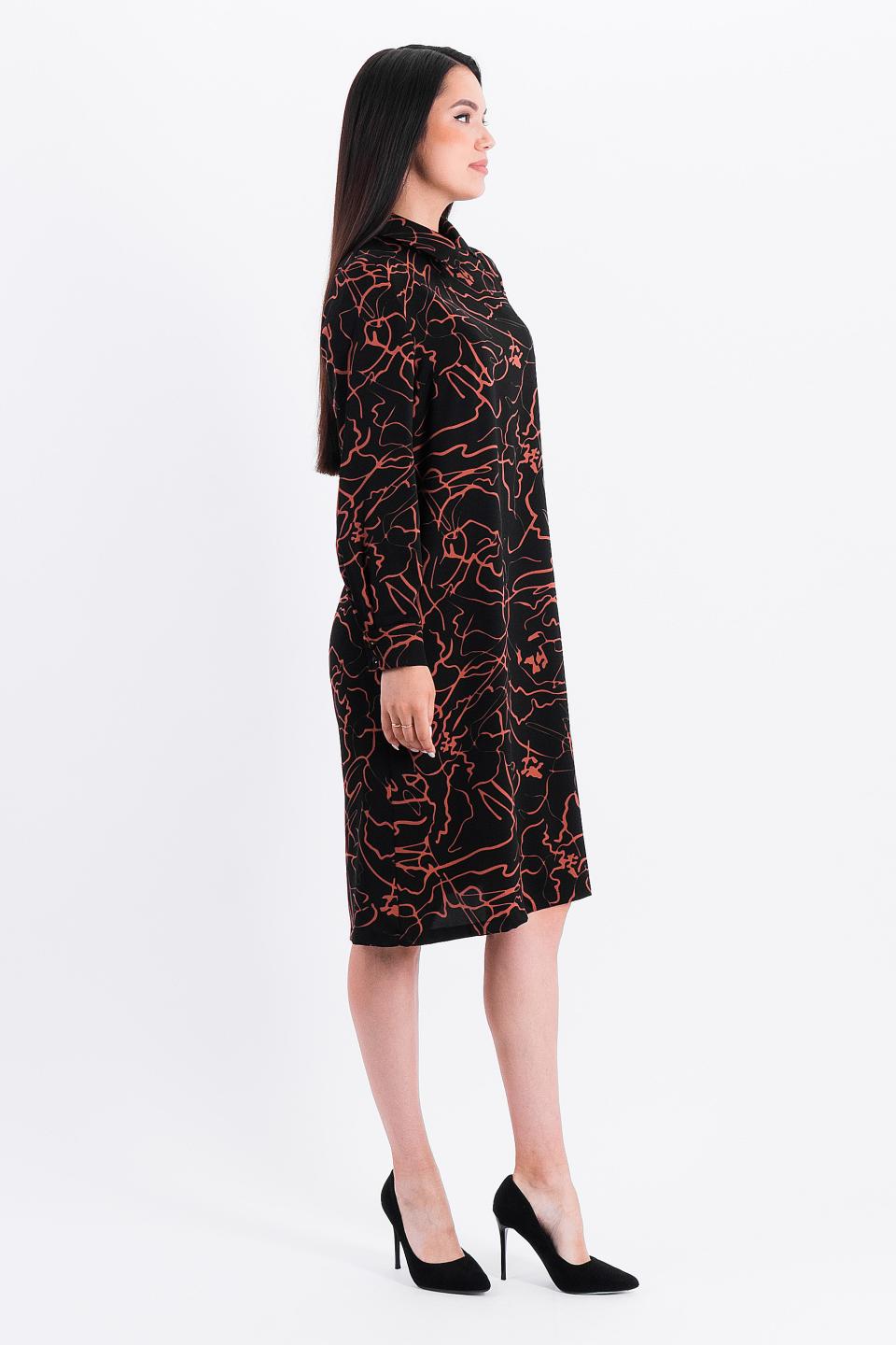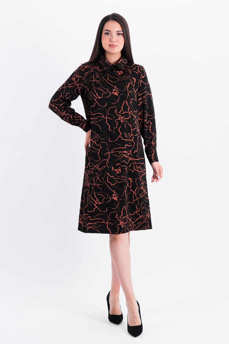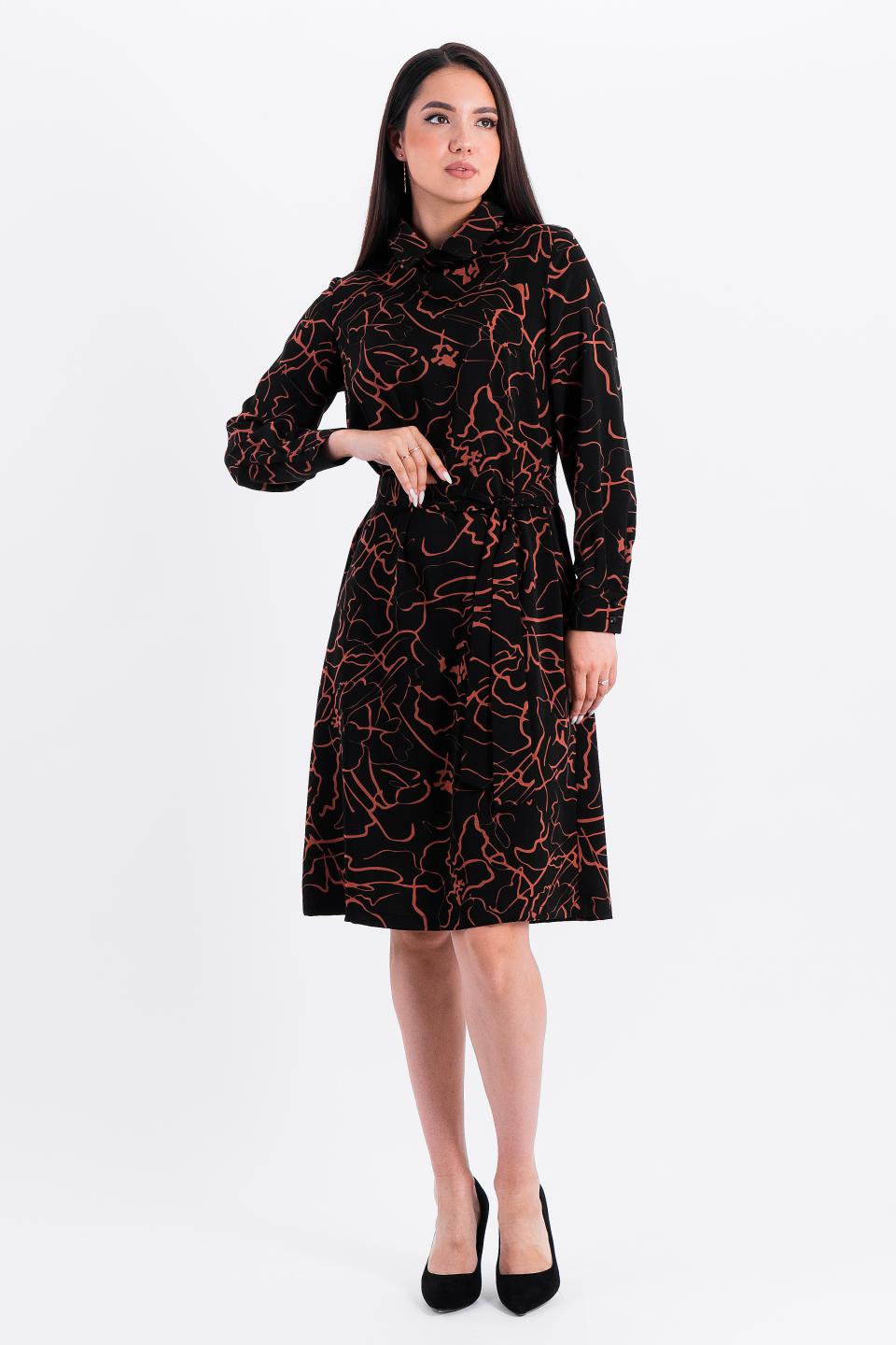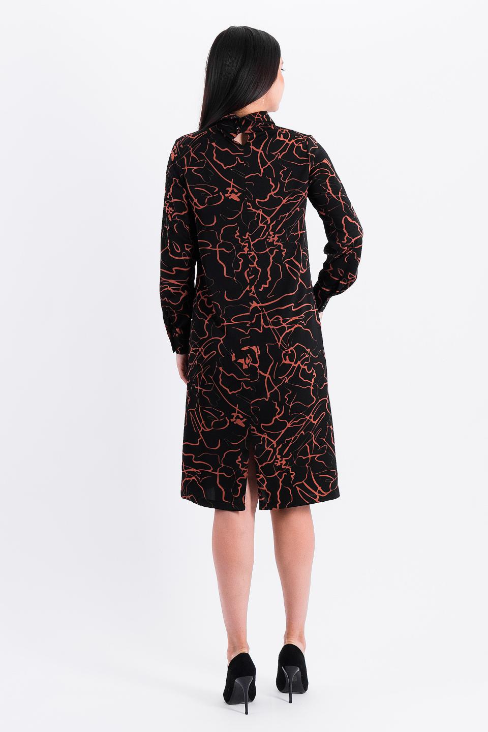 Описание: Слегка расклешенное платье притягивает взгляды необычными элементами- застроченные складки по кокетке и центру рукава прекрасно гармонируют с компактным воротничком на стойке и декоративным галстуком-бантом.