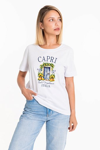 Женская футболка с принтом изготовлена из хлопкового полотна, что обеспечивает комфорт и хорошую воздухопроницаемость. Футболка имеет короткий рукав и круглый вырез горловины, что придает ей классический стильный вид. Такая модель футболки отлично сочетается с джинсами, брюками или юбкой. Изготовленная из натуральной ткани, футболка обеспечит комфорт в течение всего дня.