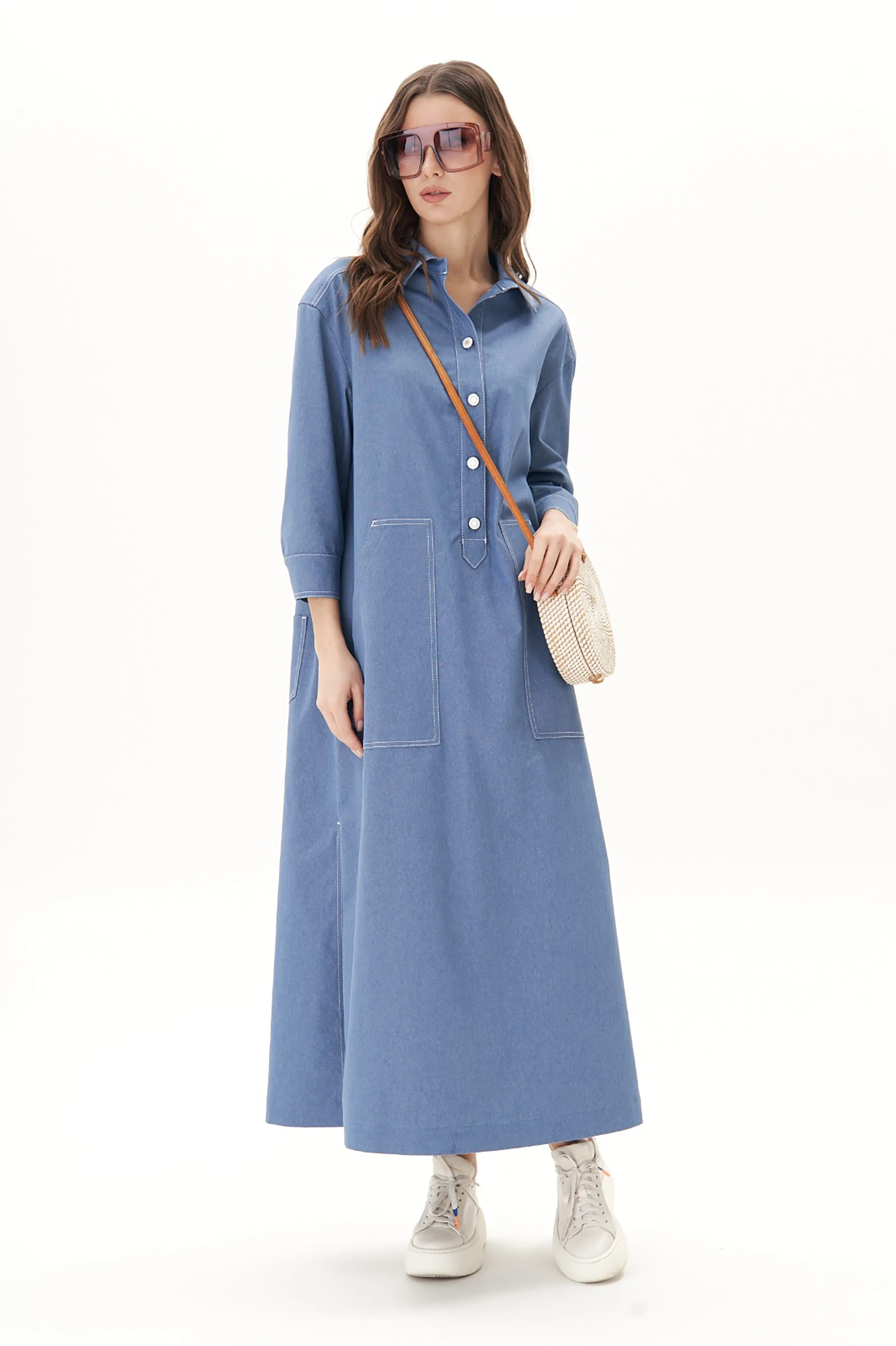 Платье свободного А-силуэта, рубашечного покроя с заниженной линией плеча, рубашечным воротником и рукавом. Полочка с частичной застежкой и накладными фигурными карманами. Спинка с отрезной кокеткой, средним швом и накладными задними карманами. Рукав с локтевой планкой и притачной манжетой с петлей и пуговицей. По боковым швам - разрезы. Все конструктивные элементы платья подчёркнуты контрастными отделочными строчками.
