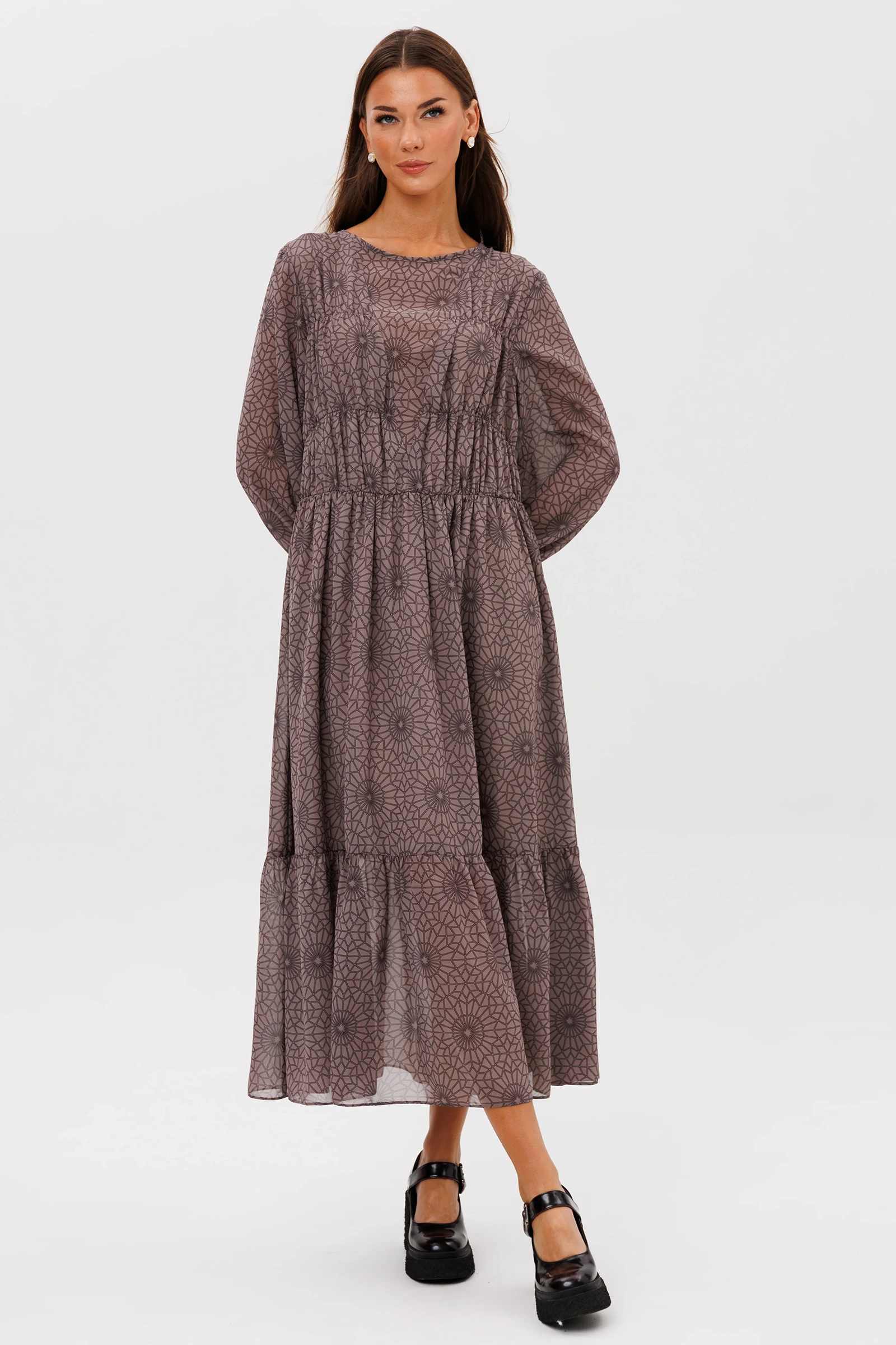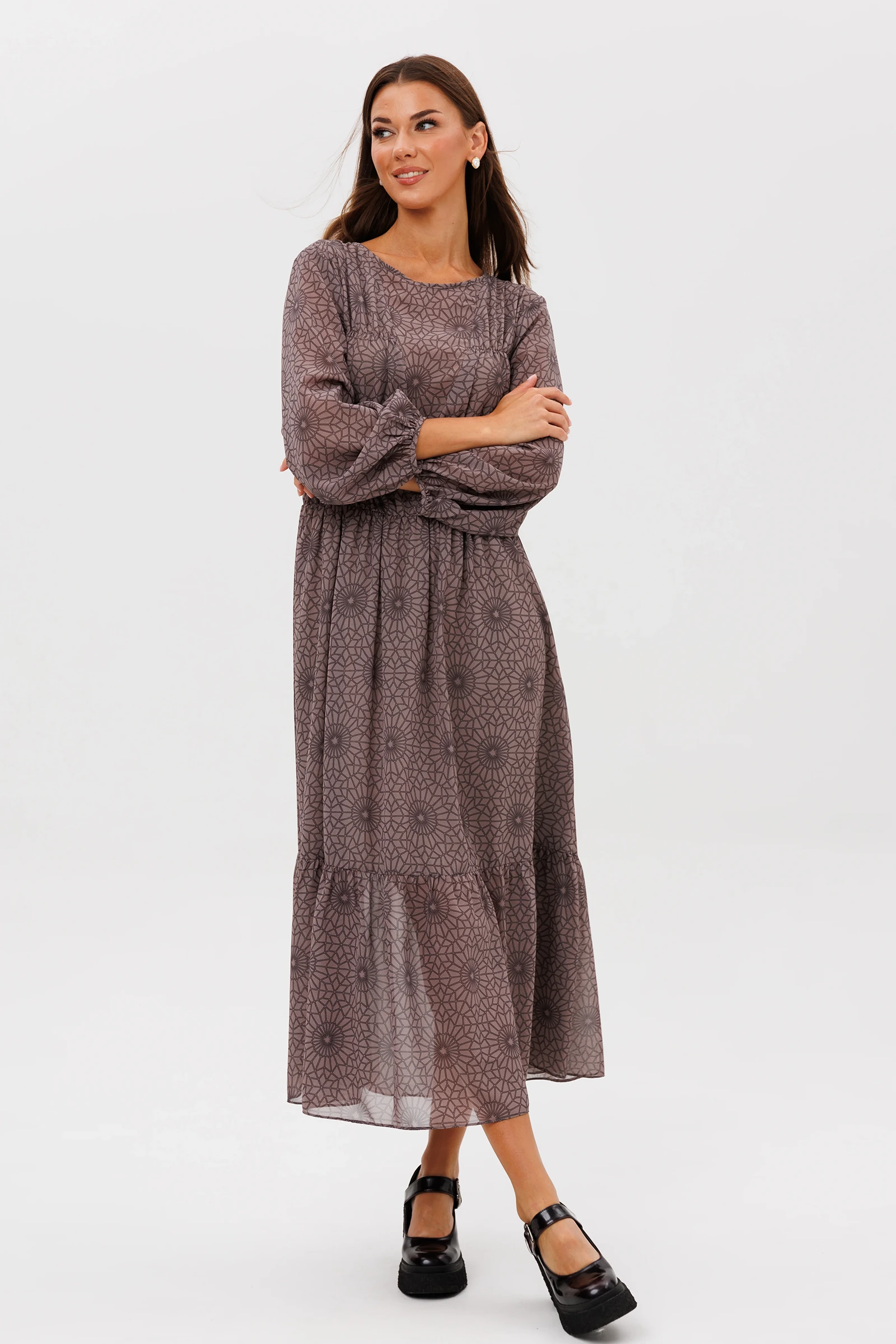 Легкое и воздушное, микс нежности и дерзости, воплощенный в комбинации противоположностей: нежного шифона и геометрического принта. А-образный силуэт, втачной рукав, со сборкой по низу, круглая горловина. Платье отрезное, чуть выше линии талии, лиф полочки с V-образным подрезом и легкой сборкой в боковой части на эластичную венгерку. Боковая часть на подкладке. Лиф спинки со средним швом и застежкой. По линии талии-эластичная тесьма.
